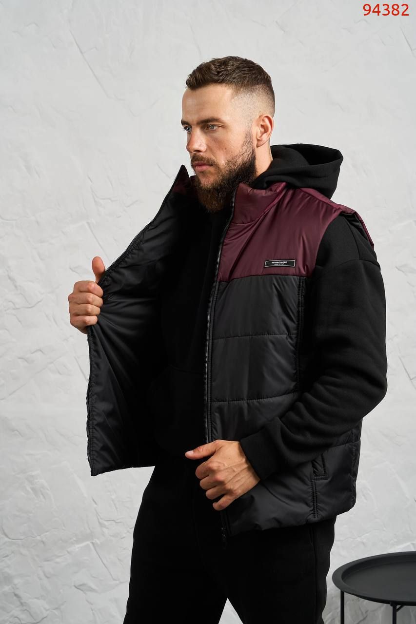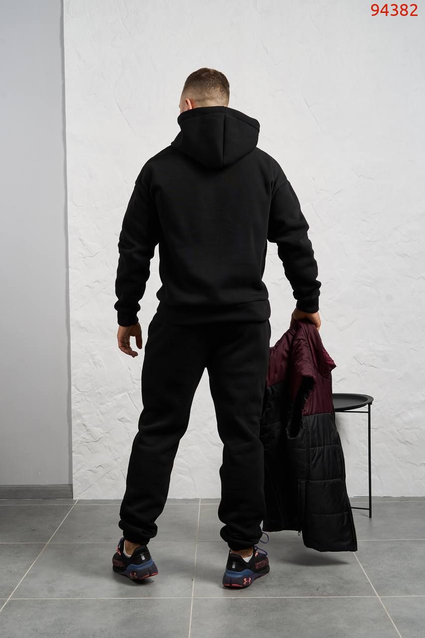 Стильний чоловічий комплект для прохолодної погоди. Складається з утепленого жилета та зручного бтеплого спортивного костюма, з кишенею кенгуру, збоку прикрашен нашивкою, з капюшоном. Рукава на манжетах. Штани прямі, висока посадка з кишенями, і знизу на гумці. Жилет