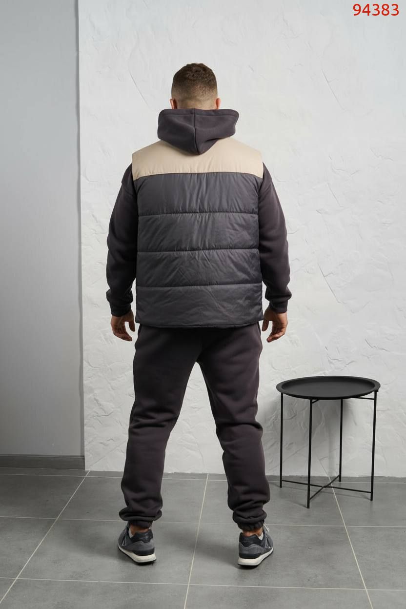 Стильний чоловічий комплект для прохолодної погоди. Складається з утепленого жилета та зручного бтеплого спортивного костюма, з кишенею кенгуру, збоку прикрашен нашивкою, з капюшоном. Рукава на манжетах. Штани прямі, висока посадка з кишенями, і знизу на гумці. Жилет