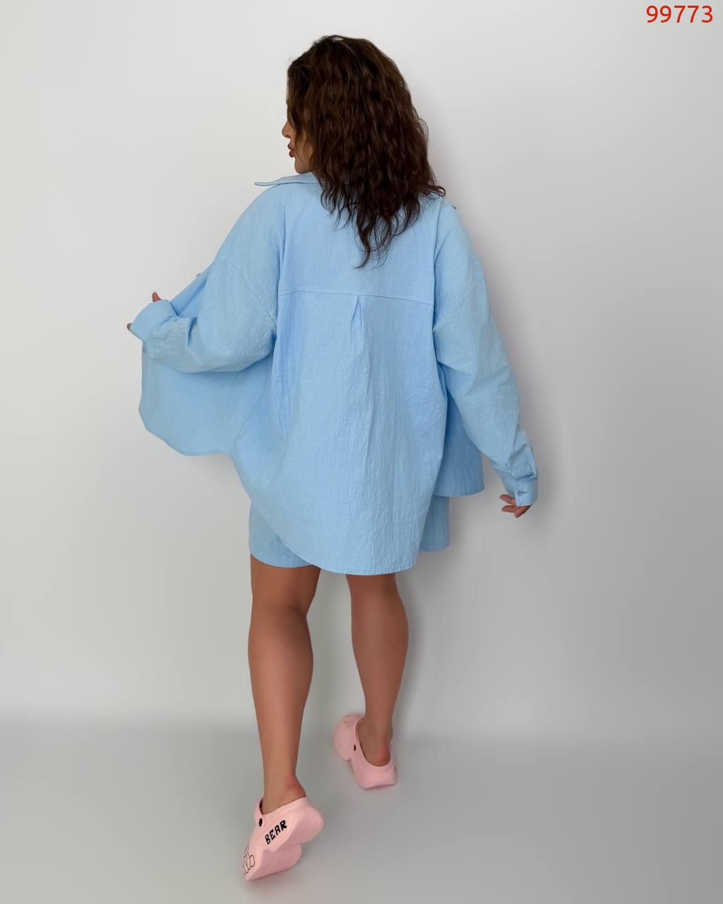 Костюм із жатого льону: сорочка на ґудзиках з карманом + шорти з кишенями у бічних швах з посадкою вище середнього на еластичній гумці та куліскою на поясі