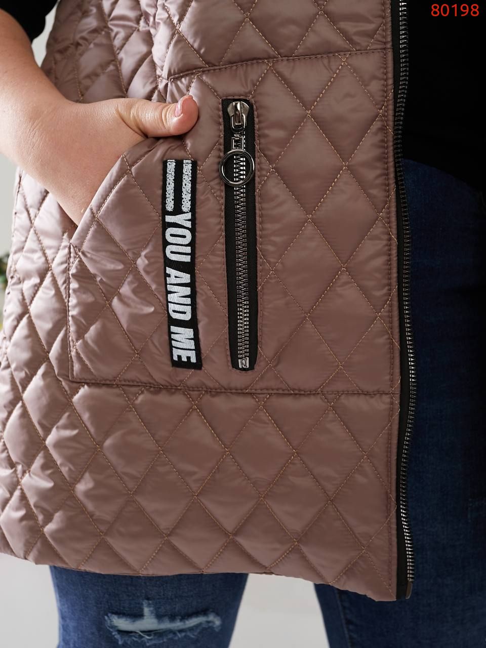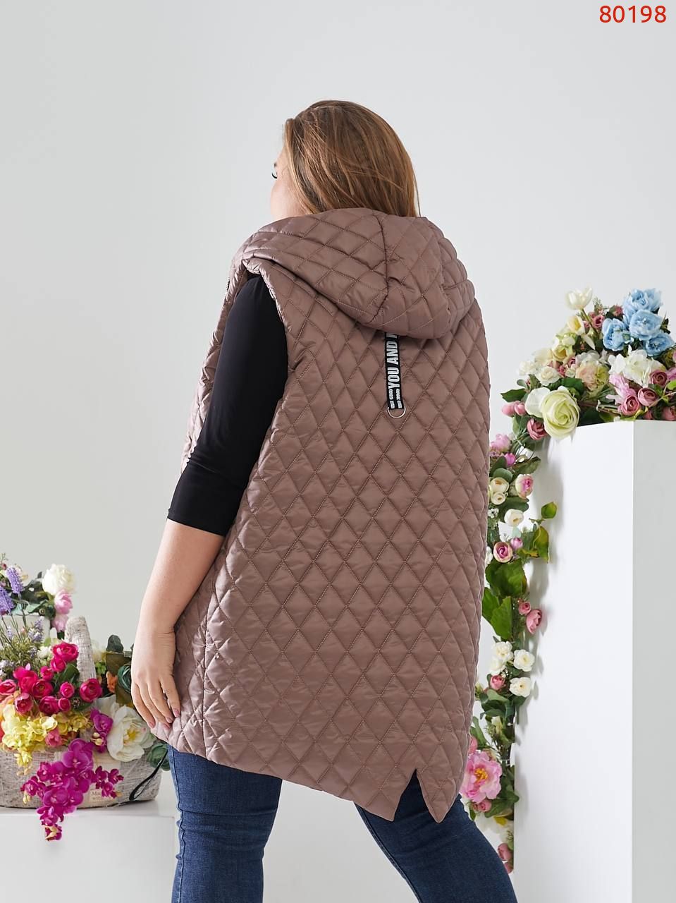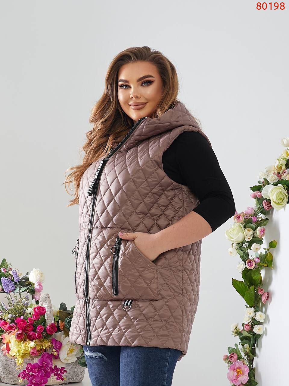 Стильна стегана жилетка з накладними кишенями, зручний глибокий капюшон, якісна фурнітура.