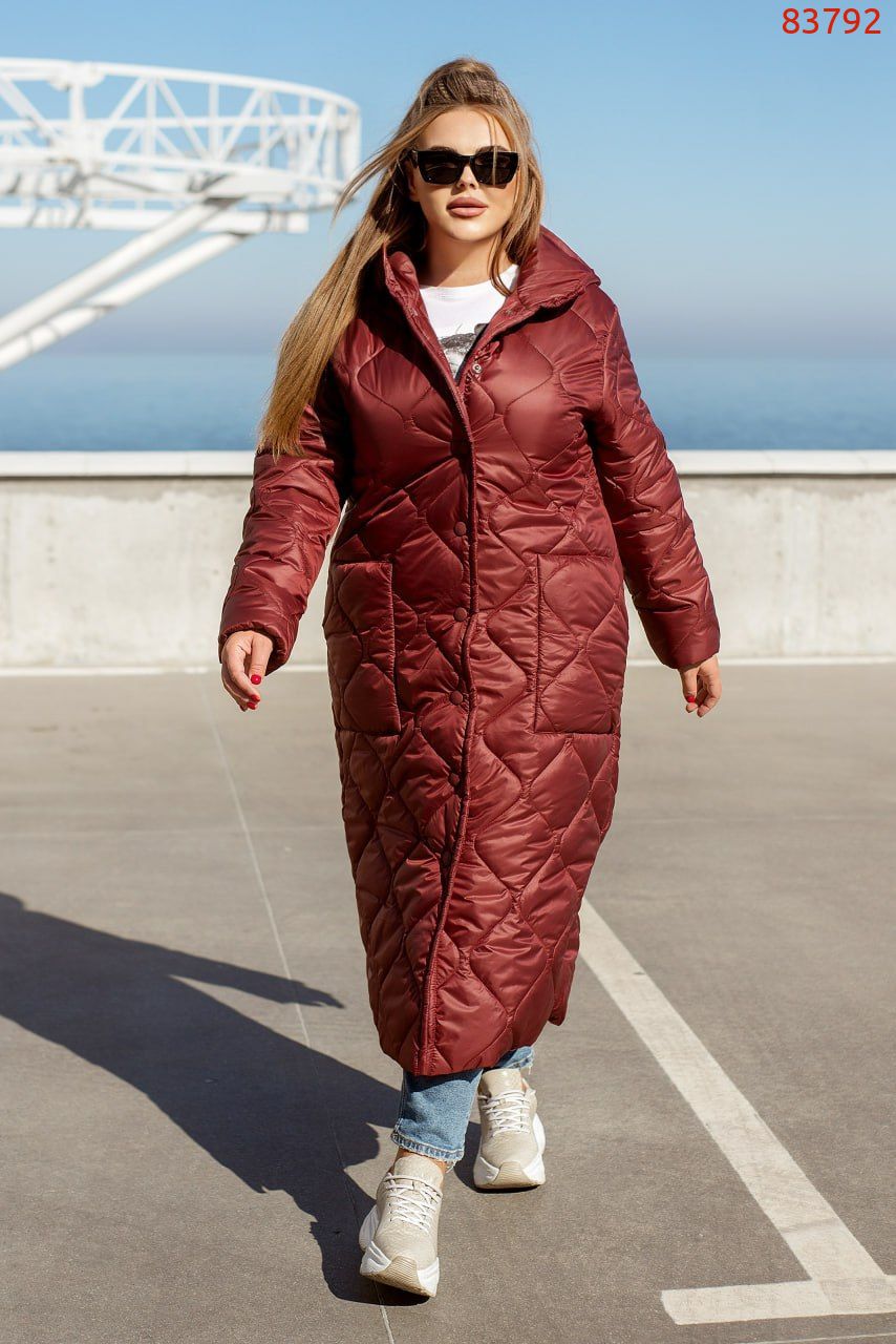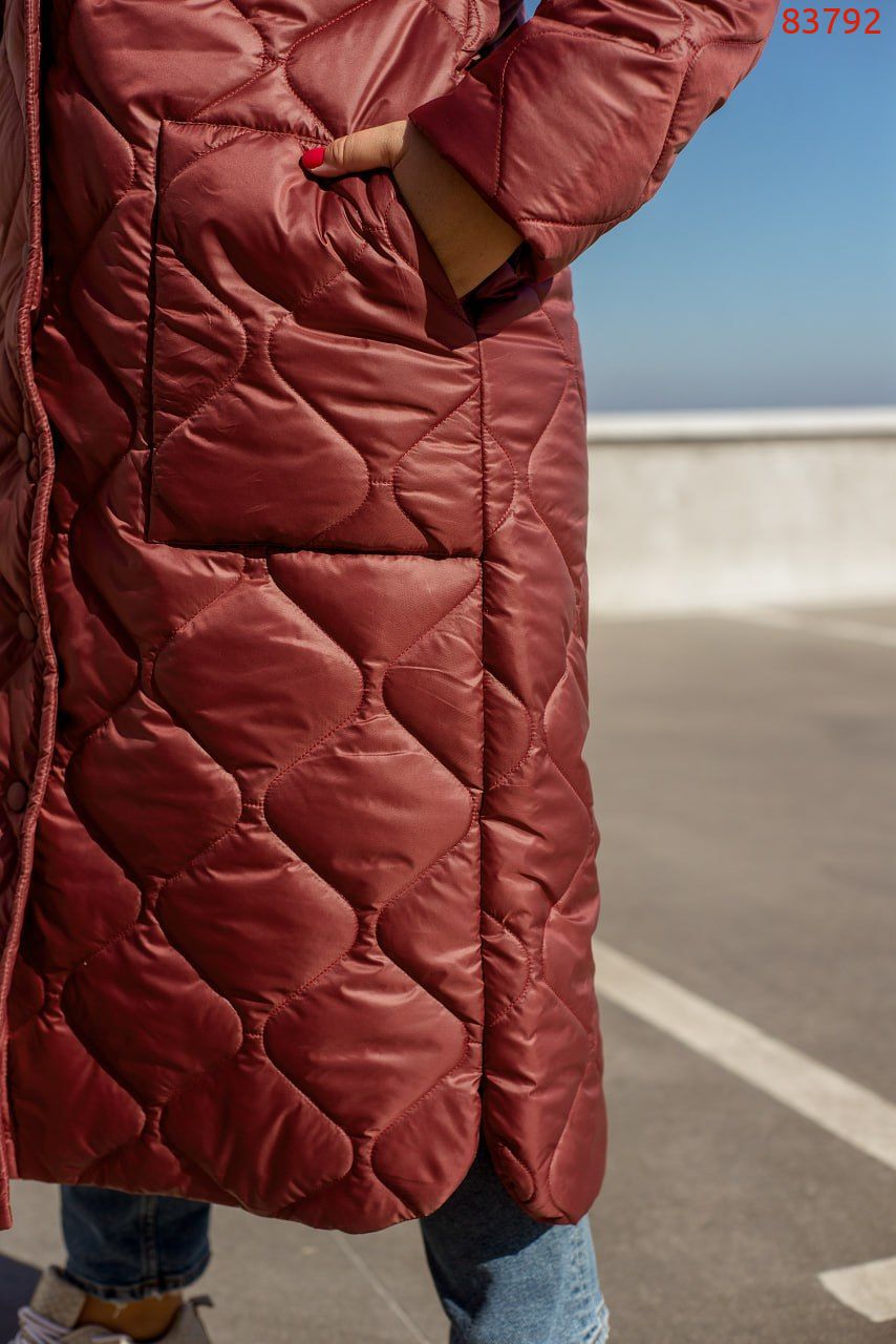 Довга стьобана куртка з пришивним капюшоном, високим коміром і довгими рукавами. Такий варіант курток майорить на стильних фешн показах вже другий рік та досі не втрачає своєї популярності. Куртка застібається на ряд кнопок спереду. Ми додали також накладні кишені на основній частині виробу. Така куртка легко поєднується з будь-якими елементами гардеробу, а також в ній буде однозначно тепло, адже ми додали наповнювач синтепон 200 та силікон. Доповніть образ високими черевиками та сумочкою і сміливо вирушайте у справах.