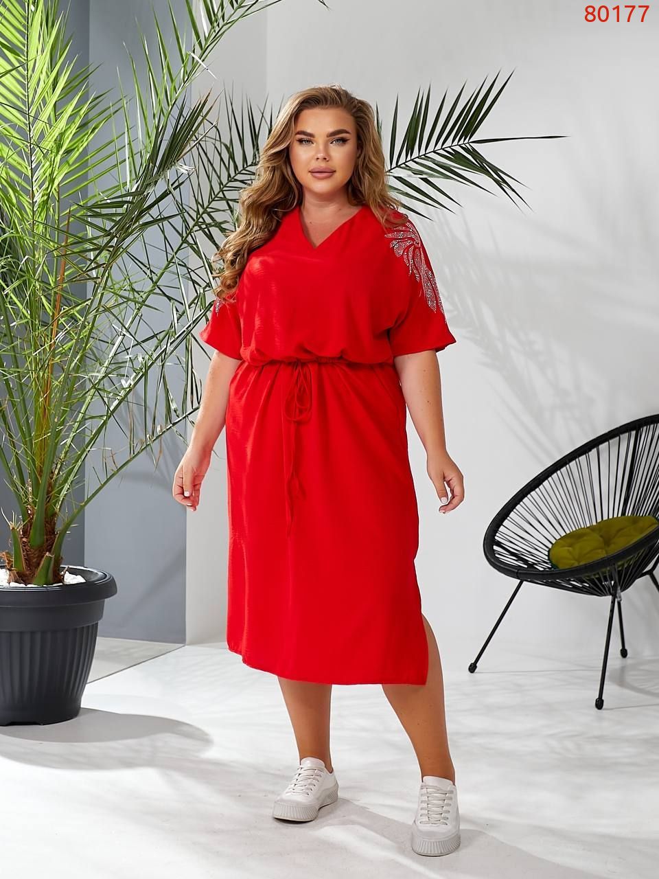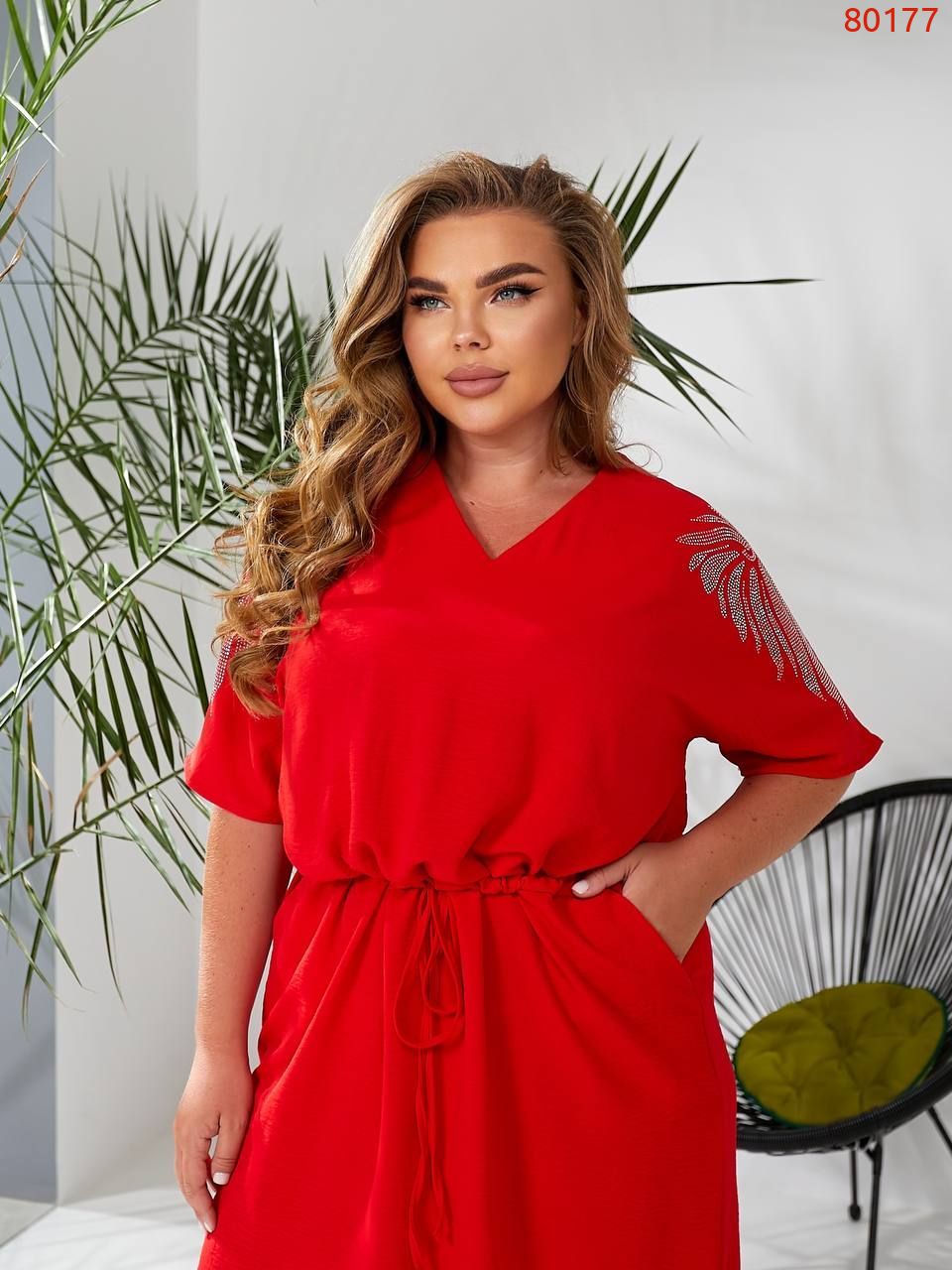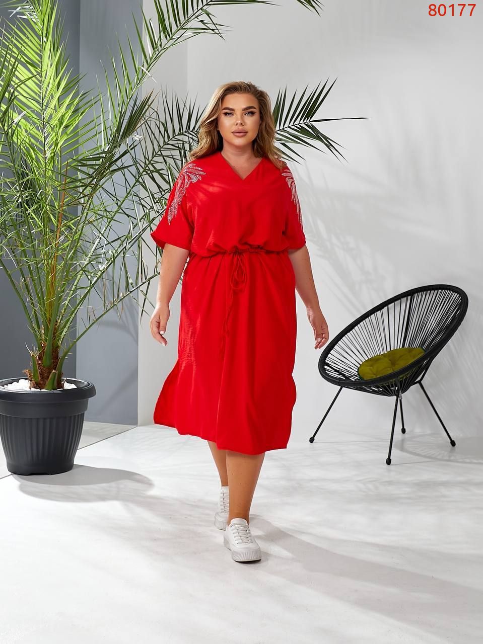 Сукня затягується на куліску на талії, з боків розрізи, кишені, плечі декоровані камінням