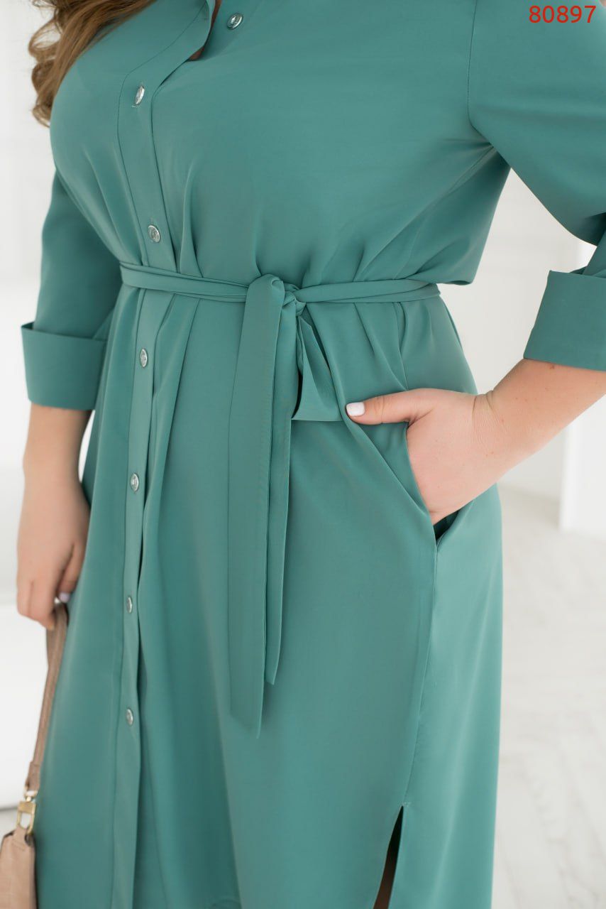 Сукня сорочка має бути в гардеробі у кожної жінки. Модель подовжена по спинці. Вортник-стійка надає ділового вигляду. Для зручності є прорізні кишені зі швів. Рукави 3/4 з декорованими гудзиками. Одягай з туфлями, кедами або черевиками для створення стильнішого образу. У комплект входить пояс у колір сукні.