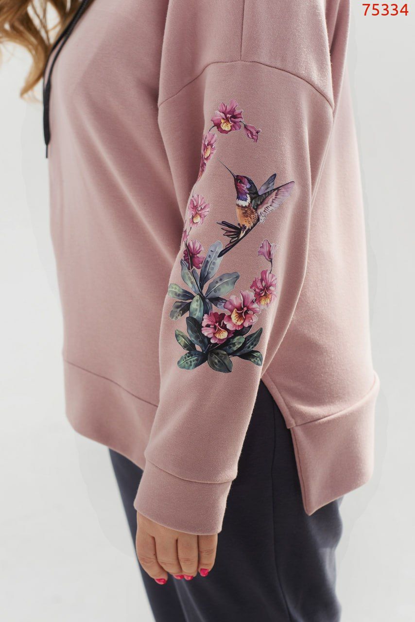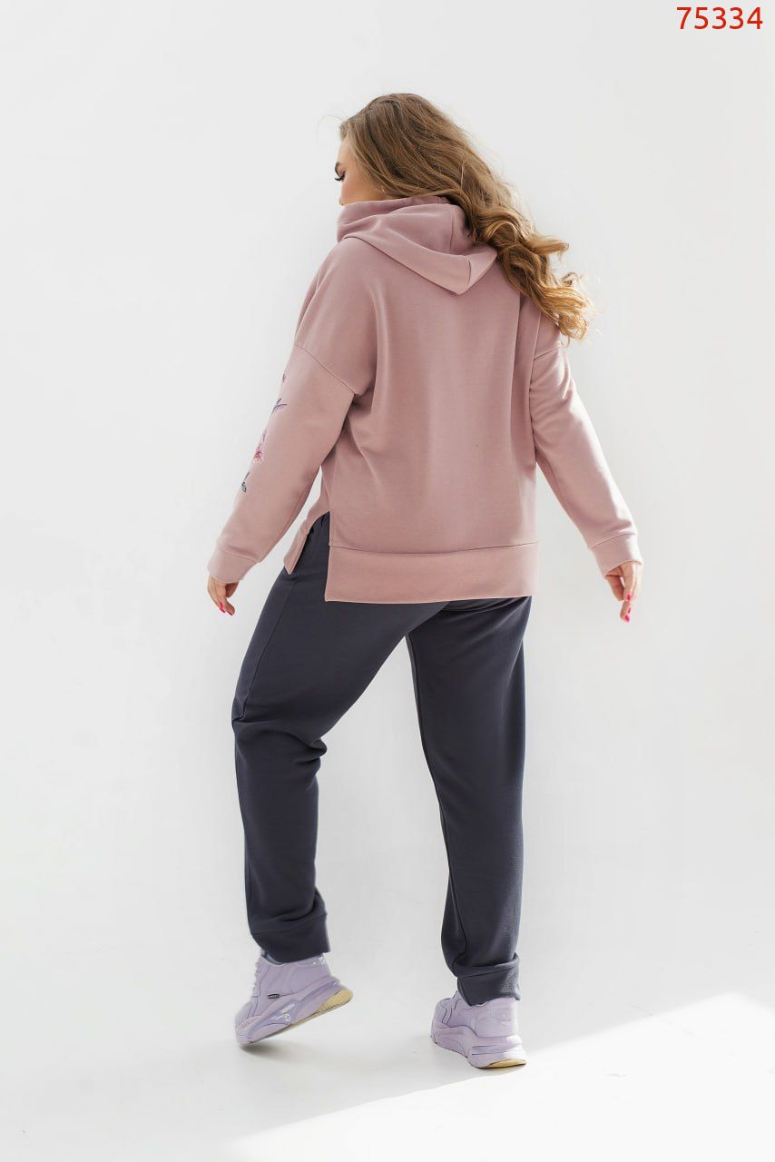 Елегантний та зручний спортивний костюм із практичної тканини – ідеальний вибір для комбінації комфорту та стилю. Толстовка з капюшоном та шнурком додає спортивний акцент, а відсутність кишень та застібки робить її максимально лаконічною. Рукава та поділ з манжетами забезпечують додатковий комфорт, невеликі розрізи по боках подолу доповнюють. Спинка трохи подовжена. Яскрава та якісна термоналіпка на худі доповнює образ і надає йому стильний акцент. Брюки з високою посадкою з гумкою та манжетів з резинкою, гарантують зручність. Кишені у швах зберігають практичність цього стильного спортивного комплекту.