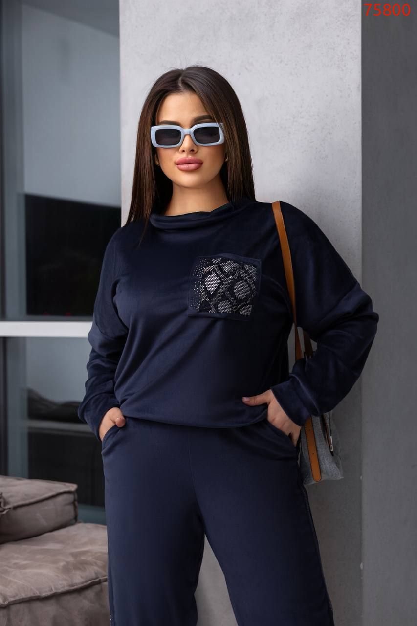 Велюровий прогулянковий костюм складається зі штанів, низ та пояс на резинці, високої посадки з двома кишенями, оздоблені лампасами зі стразами. Кишеня кофтинки - світшоту оздоблена стразами.