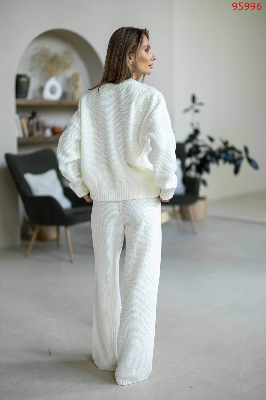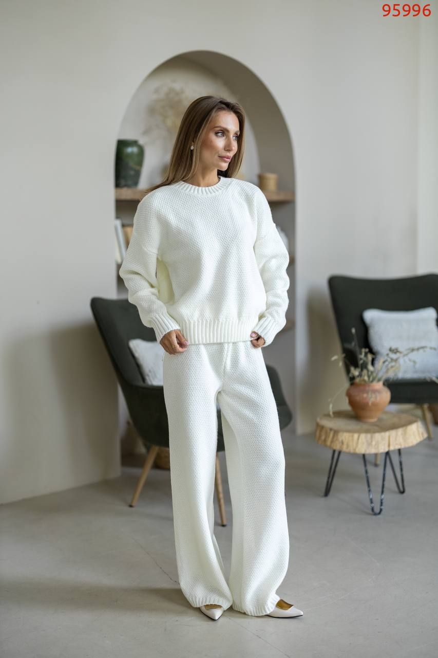 Затишний костюм із щільної фактурної в'язки з м'яким приляганням до тіла. Вільний светр та прямі штани створюють елегантний, розслаблений образ щодня.