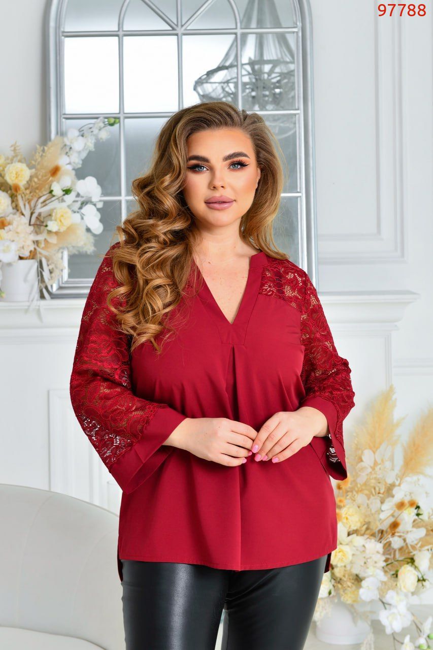 Виріз горловини V-подібний. Рукав трохи вкорочений, виконаний із високоякісного гіпюру, низ на манжеті. Низ блузи асиметричний, попереду трохи коротший. Застібок, кишень немає.