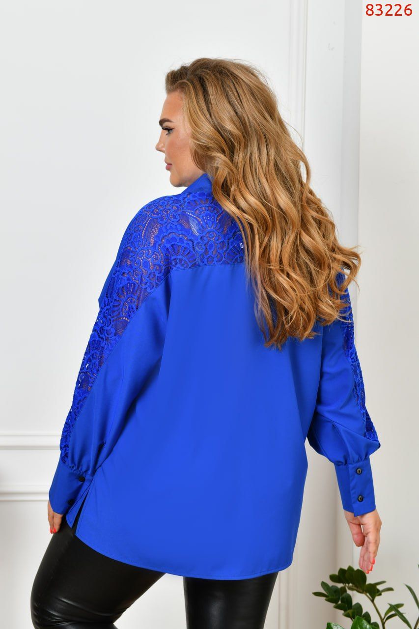Блуза застібається на гудзики по передній планці, має асиметричний низ, попереду трохи коротша. Горловина оформлена стояче-відкладним комірцем. Рукав цільнокроєний, широкий, призібраний на високий манжет із гудзиками. Позаду блуза декорована гарним гіпюром в тон основної тканини. З боків оброблені невеликі розрізи.