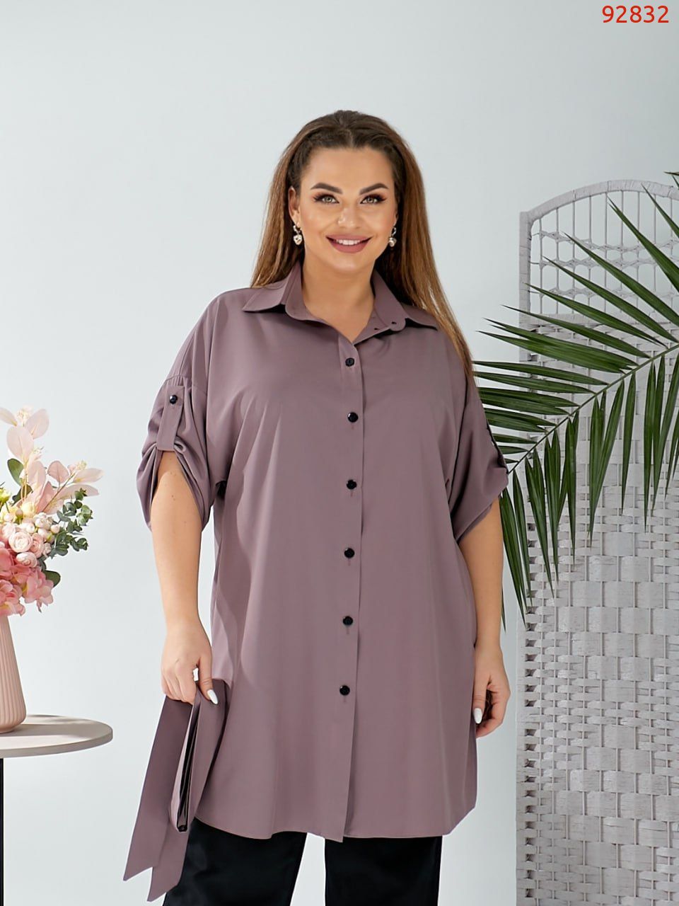Стильна блуза із софту ( тканина не тягнеться). Силует прямий, вільний, подовжений. Комір стояче-відкладений. Блуза застібається на гудзики по передній планці. Лінія плеча спущена, рукави довжиною трохи нижче ліктя, можна вкорочувати за допомогою спеціальної деталі на гудзику. Низ блузи оформлений розрізами з боків. Пояс із основної тканини в комплекті.