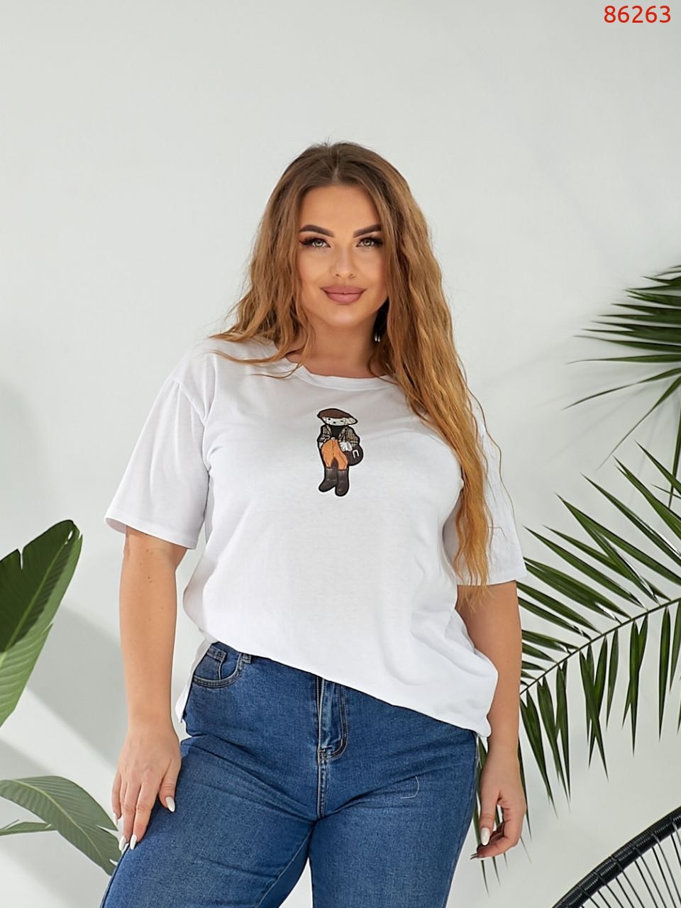ФутболкаДовжина виробу 69/70/71ОГ 118/126/134Виміри зроблені поверх виробуФутболка носиться вільноНа модели розмір 4850