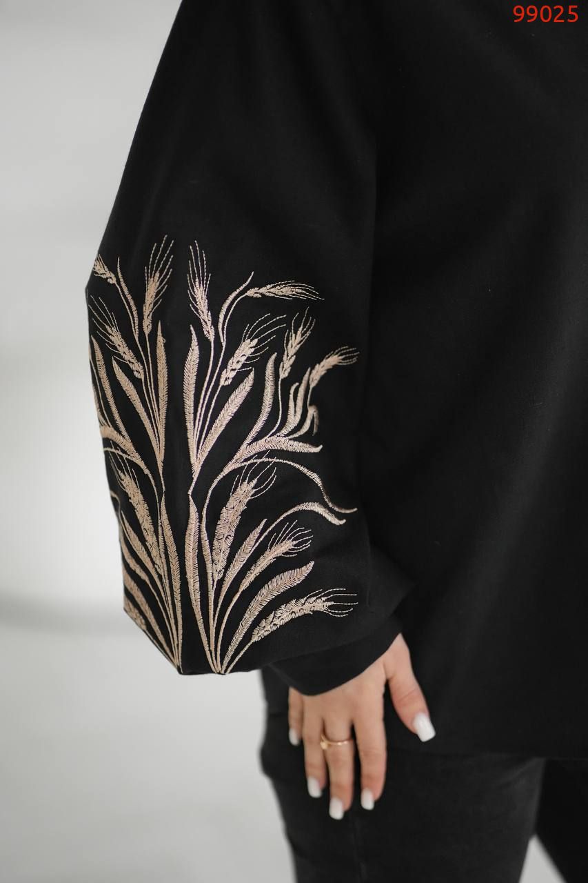 Лаконічний крій доповнений витонченою вишивкою у теплих бежево-золотистих відтінках, що створює ефект дорогого та вишуканого образу: