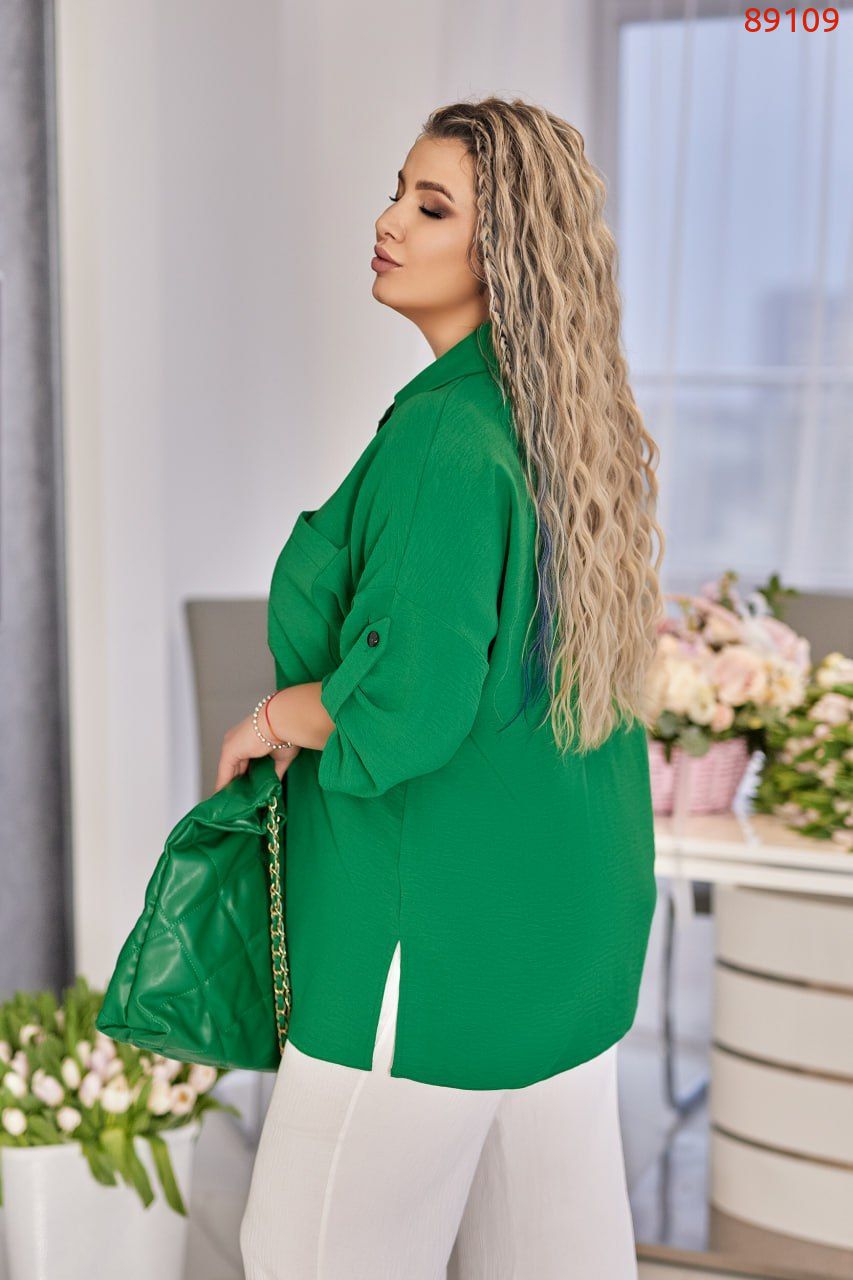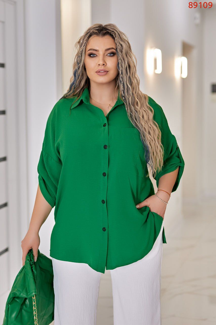 Сорочка зі стояче-відкладним комірцем, має вільний прямий силует. Попереду застібається на гудзики по планці. Лінія плеча спущена, рукав прямий, широкий, довжиною 7/8, можна вкорочувати за допомогою спеціальної деталі на гудзику. Низ оформлено двома розрізами з боків.