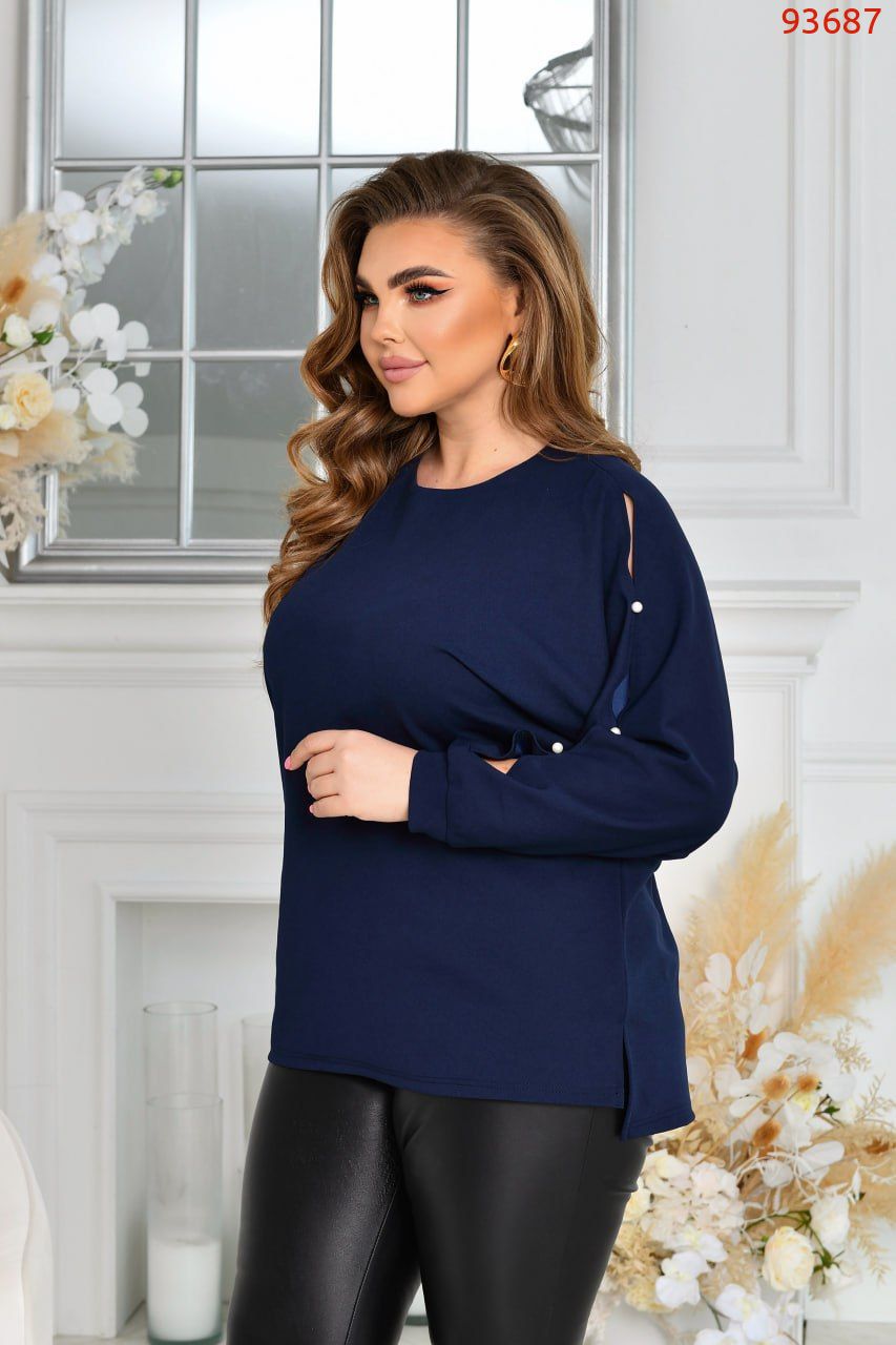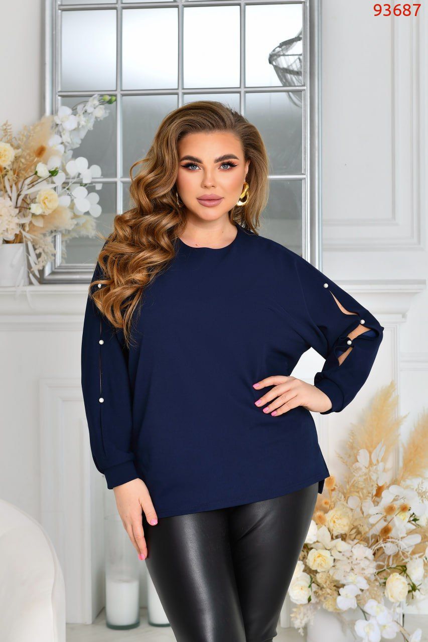 Стильна ошатна туніка із трикотажу креп-стретч (розтяжність середня). Силует «летюча миша». Виріз горловини круглий. Рукави на манжетах, цільнокроєні, виконані дуже оригінально із прорізями, декоровані якісними штучними пробивними перлинками ( закріплені надійно). Низ туніки асиметричний, попереду трохи коротший. З боків оброблені невеликі розрізи. Застібок, кишень немає.