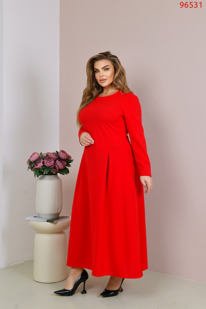 Силует сукні довгий, напівприталений. Виріз горловини круглий, рукави повної довжини. Лінія талії відрізна, трохи занижена, спідниця із защипами, в бічних швах оброблені кишені. Застібки немає. Внизу з боків розрізи, що додає образу жіночності. Сукня добре приховує будь-які недоліки та робить силует стрункішим. Ідеально підійде як для повсякденних справ, так і на свята, якщо додати аксесуарів.