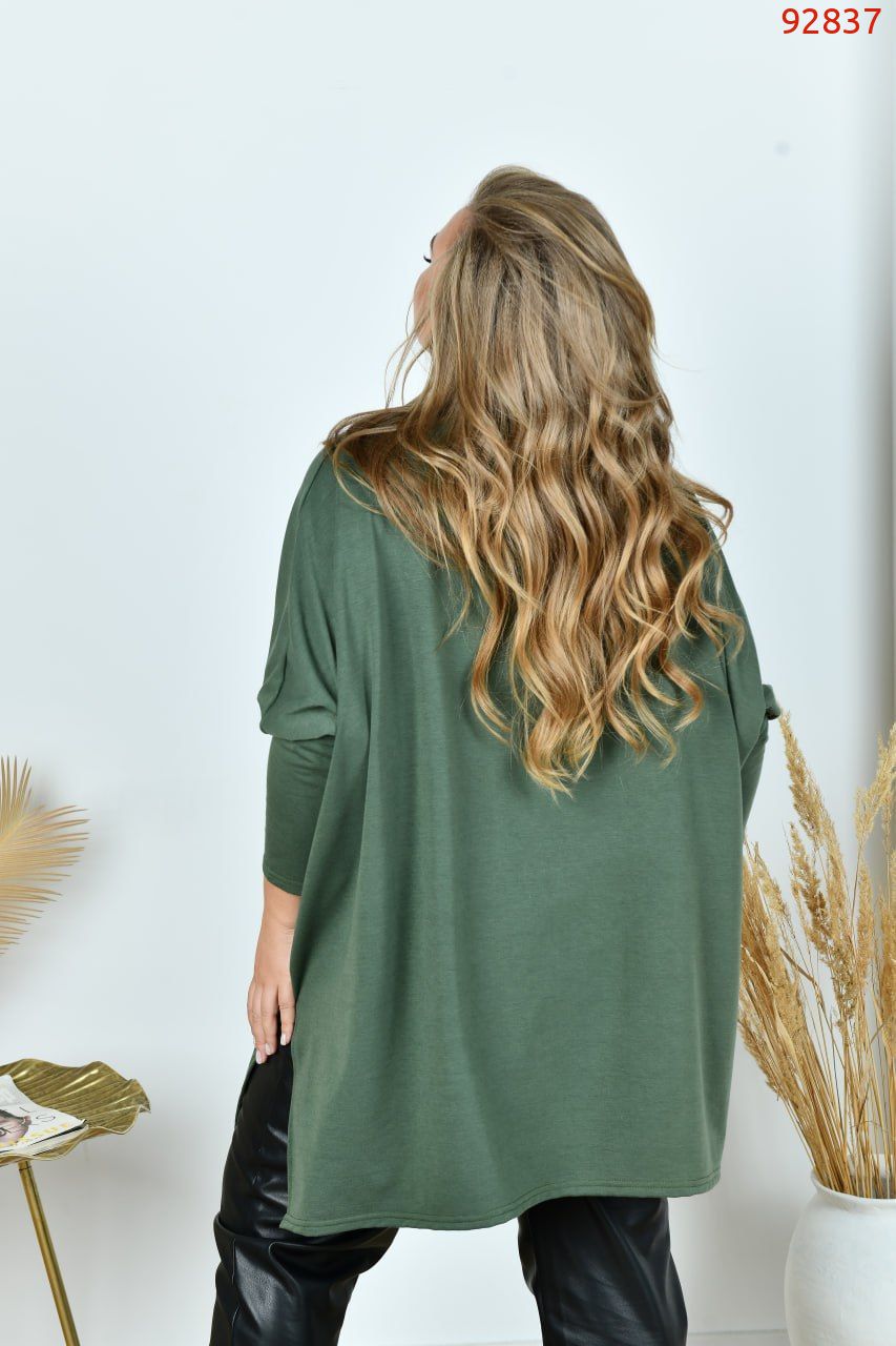 Обʼємна туніка з круглим вирізом горловини. Низ оброблено боковими розрізами. Рукав оригінальної форми, від ліктя завужується. Кишень, застібок немає