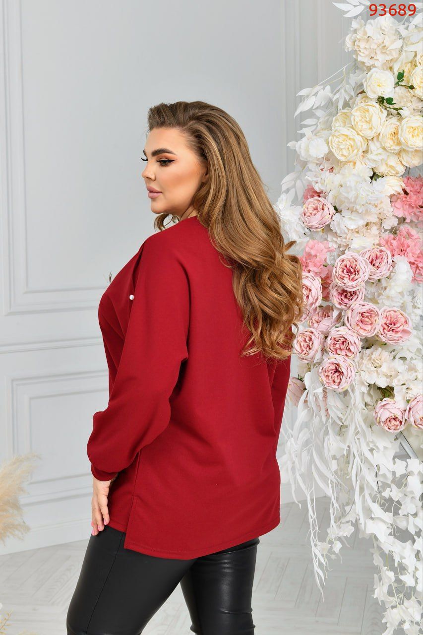 Стильна ошатна туніка із трикотажу креп-стретч (розтяжність середня). Силует «летюча миша». Виріз горловини круглий. Рукави на манжетах, цільнокроєні, виконані дуже оригінально із прорізями, декоровані якісними штучними пробивними перлинками ( закріплені надійно). Низ туніки асиметричний, попереду трохи коротший. З боків оброблені невеликі розрізи. Застібок, кишень немає.