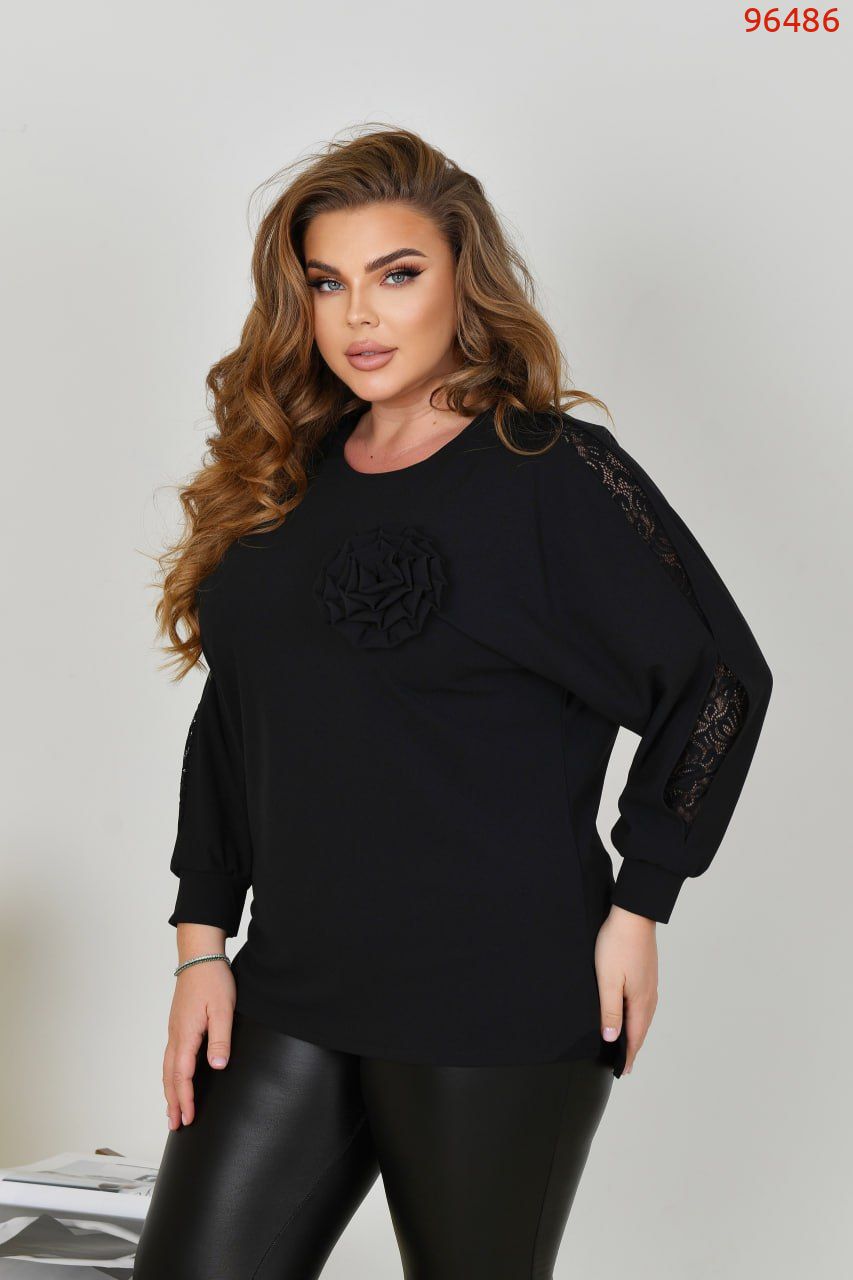Стильна та вишукана туніка вільного прямого силуету із трикотажу креп-стретч (розтяжність середня), виріз горловини круглий, рукав 3/4. Низ асиметричний, з невеликими розрізами. Туніку декоровано трояндою із основної тканини (за потреби можна зняти). Кишень та застібок немає.