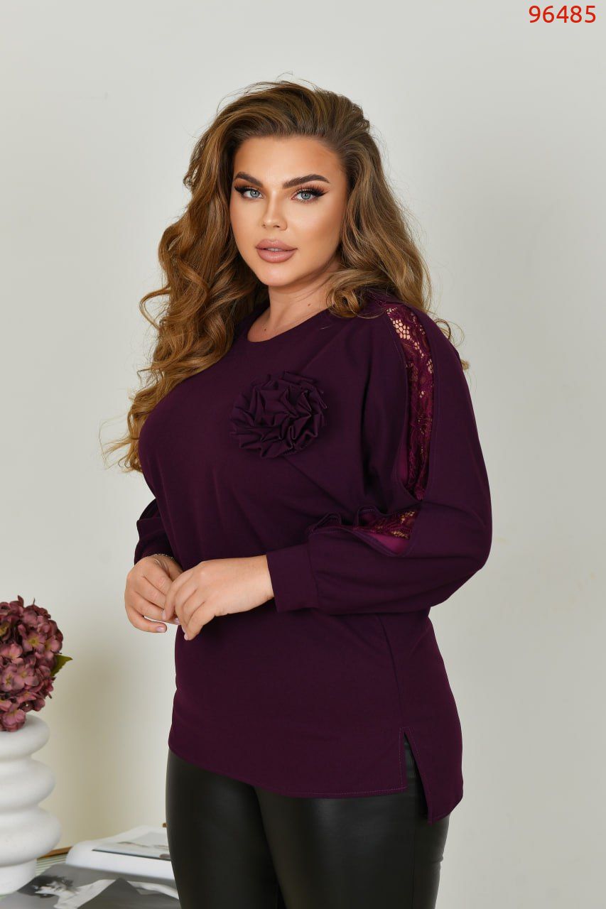 Стильна та вишукана туніка вільного прямого силуету із трикотажу креп-стретч (розтяжність середня), виріз горловини круглий, рукав 3/4. Низ асиметричний, з невеликими розрізами. Туніку декоровано трояндою із основної тканини (за потреби можна зняти). Кишень та застібок немає.