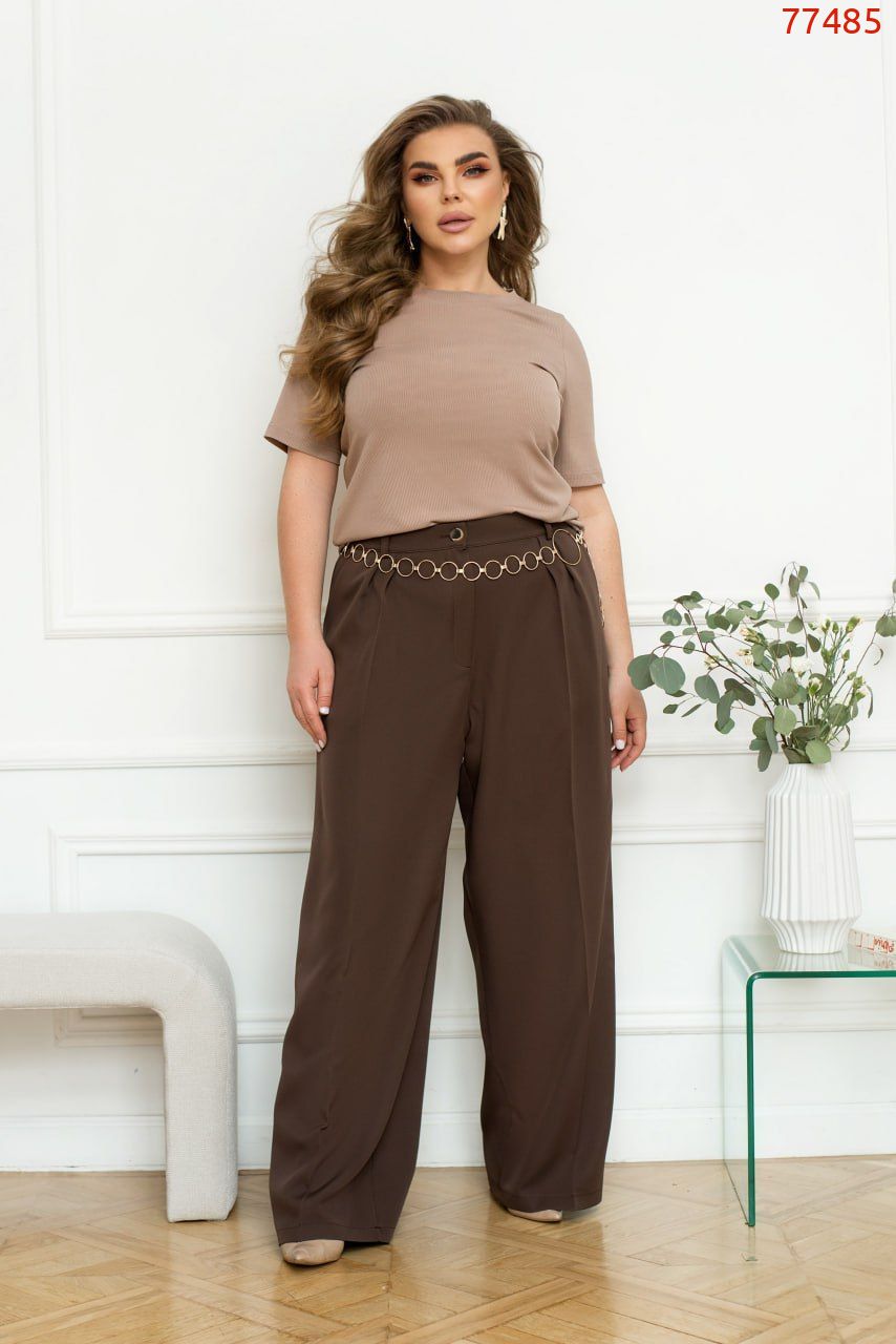 Вишукані брюки актуального крою – палаццо, які знайдуть місце в будь-якому гардеробі, а ще чудово сідає по фігурі. Цей крій і защипи спереду надають штанам особливого шарму і роблять їх незамінними як для офісних, так і для повсякденних луків. Застібаються на ґудзик і блискавку. Ми доповнили штани шльовками, щоб ви могли стилізувати їх зі своїм улюбленим поясом. З боків є кишені для дрібниць.