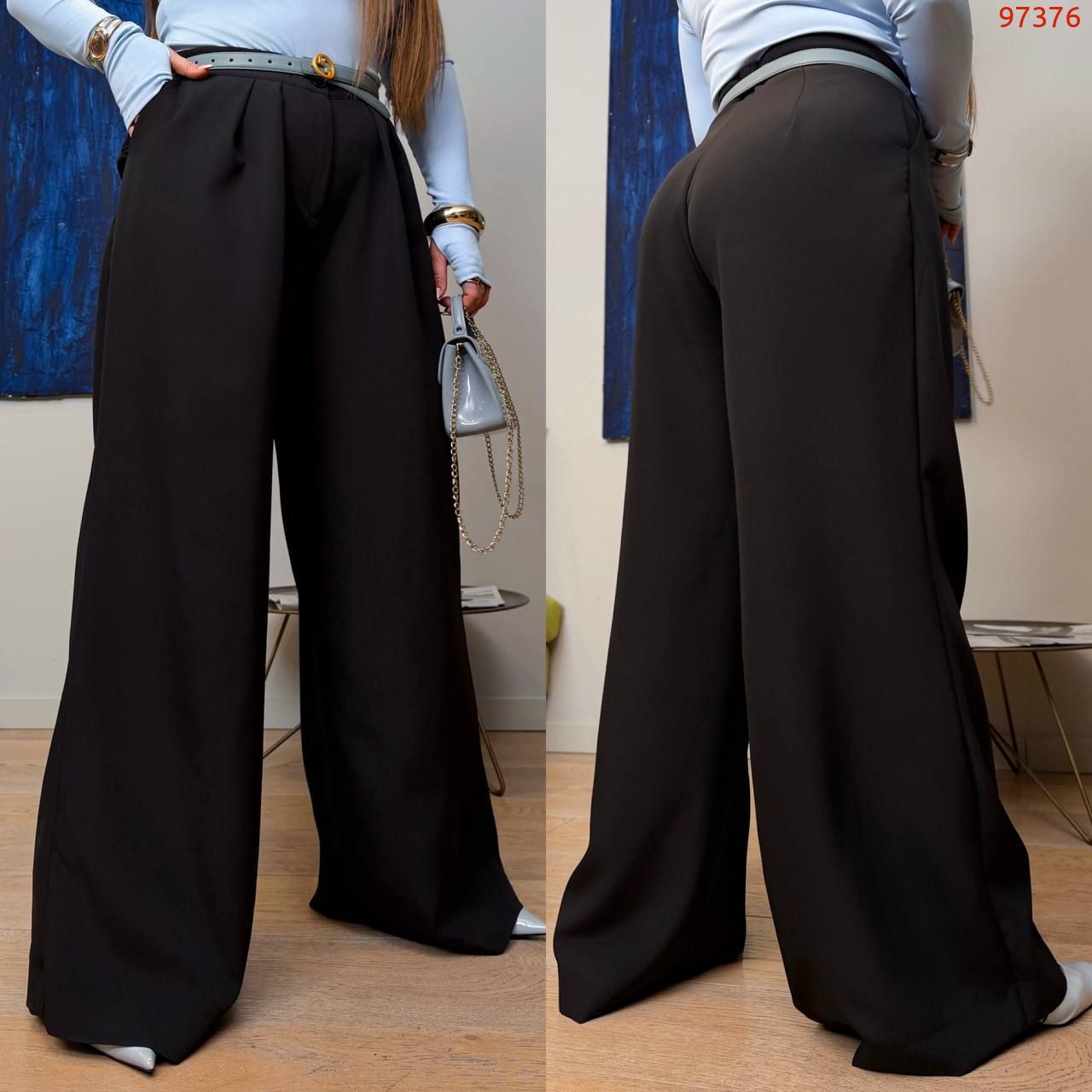 Широкий крій візуально подовжує ноги, висока посадка підкреслює талію. Щільна костюмна тканина не мнеться, добре тримає форму. Фігура виглядає стрункішою.