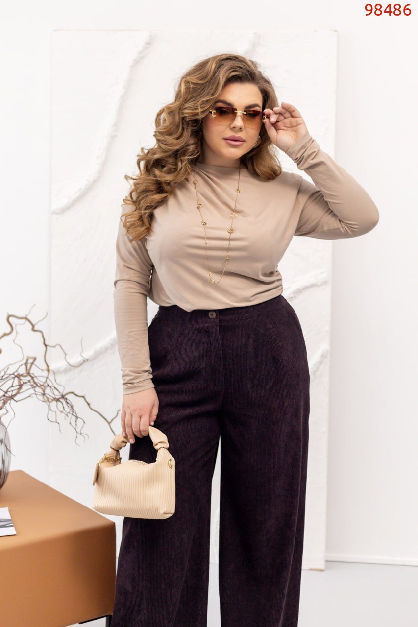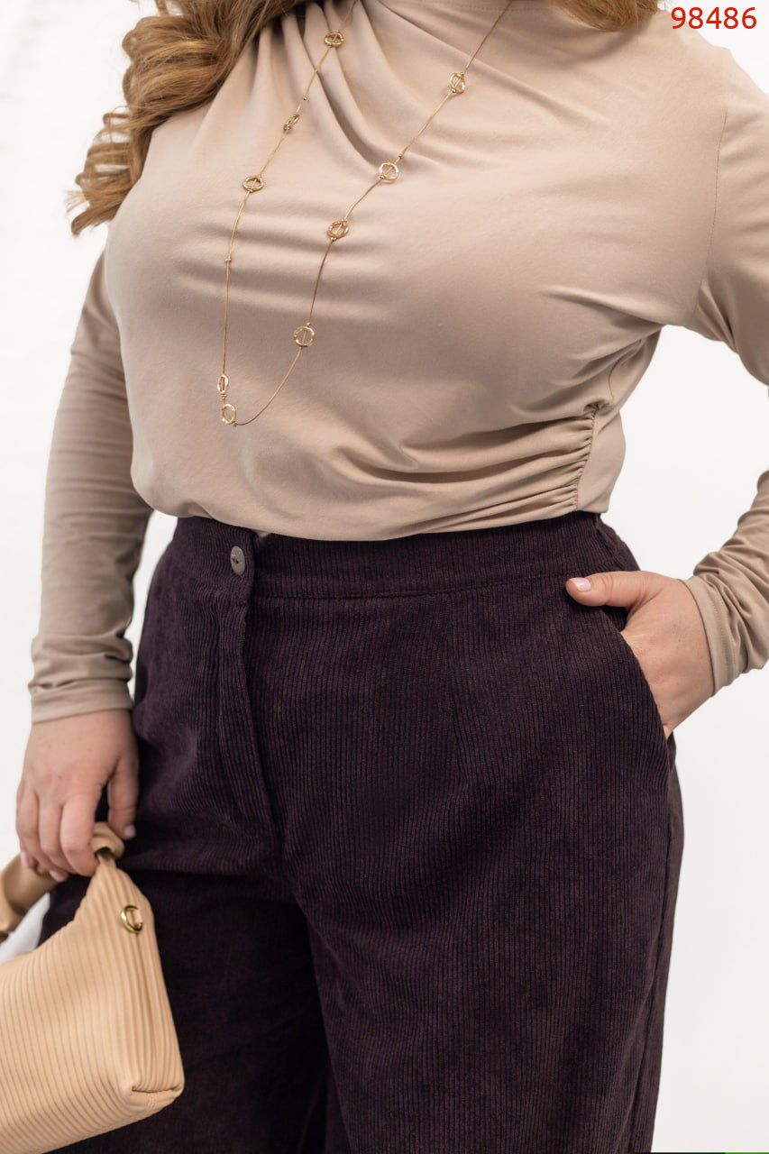 Ці класичні брюки з вельвету – стильне поєднання фактурності та комфорту. М’яка тканина з виразним рубчиком додає образу глибини та благородного вигляду, а стрілки формують витончений силует і візуально подовжують ноги. Модель доповнена зручними кишенями, що зберігають практичність без зайвого об’єму. Ззаду на талії – еластична вставка, яка забезпечує комфортну посадку та акуратно підлаштовується під фігуру. Брюки застібаються на ґудзик і блискавку, гарантуючи надійну фіксацію та бездоганний вигляд. Ідеальний варіант як для офісу, так і для стильних повсякденних образів. Легко комбінуються із сорочками, блузами чи жакетами, а також чудово виглядають як із підборами, так і з лаконічним взуттям на низькому ходу. Це ті брюки, які додають образу впевненості й шарму з першого погляду. Пояс НЕ входить в комплект.