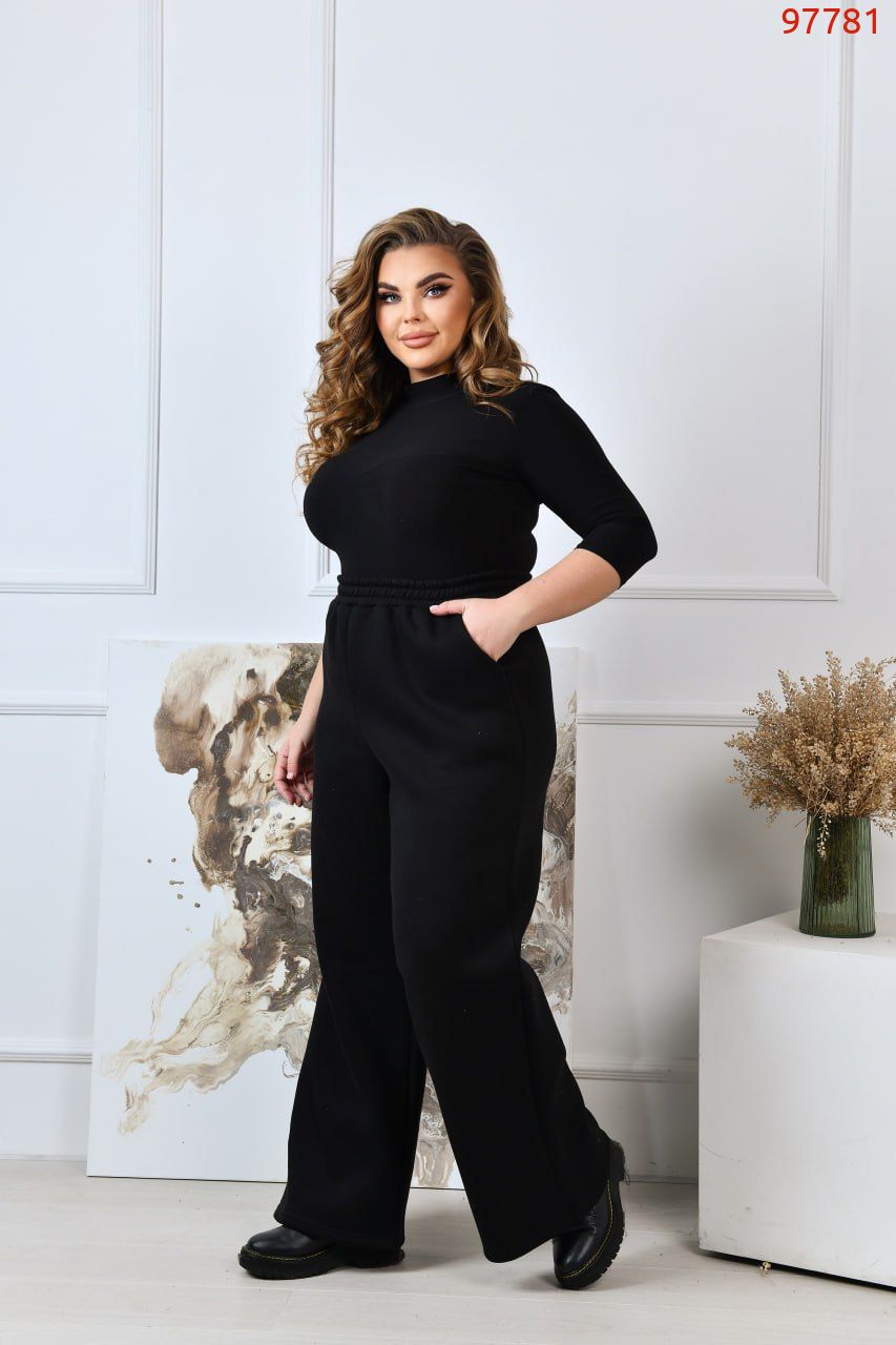 Стильні прямі широкі брюки-палаццо виготовлені з якісного трикотажу тринитка з начосом, що забезпечує середню розтяжність матеріалу та комфорт під час носіння. Ці брюки мають посадку, яка розташована трохи вище середньої, завдяки чому вони стильно підкреслюють талію, а еластична резинка по талії додає зручності і дозволяє прекрасно підлаштуватися під фігуру. В бокових швах розташовані практичні кишені, які не тільки доповнюють дизайн виробу, але й додають функціональності й зручності в повсякденному використанні.