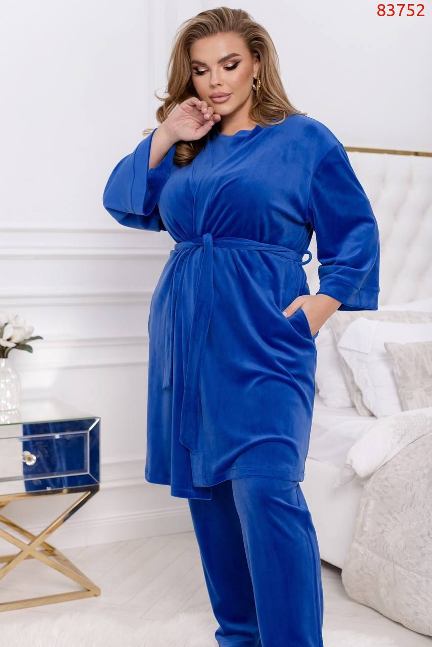 Стильний та комфортний костюм-трійка батал. В комплекті халат з кишенями по сторонам, декорований візерунком зі страз на спині, застібок немає, в комплекті пасок, для нього - дві шлівки по сторонам. Футболка без застібок та кишень, на грудях - візерунок зі страз. Горловина півкругла, рукава з невеликими м'якими манжетами. Брюки з високою талією, вшитою до пояса резинкою та кишенями в швах.