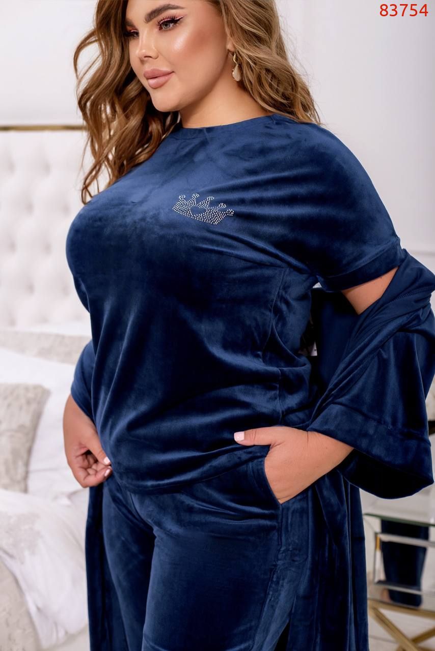 Стильний та комфортний костюм-трійка батал. В комплекті халат з кишенями по сторонам, декорований візерунком зі страз на спині, застібок немає, в комплекті пасок, для нього - дві шлівки по сторонам. Футболка без застібок та кишень, на грудях - візерунок зі страз. Горловина півкругла, рукава з невеликими м'якими манжетами. Брюки з високою талією, вшитою до пояса резинкою та кишенями в швах.