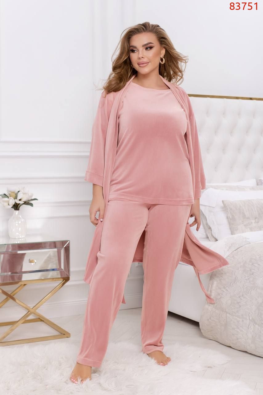 Стильний та комфортний костюм-трійка батал. В комплекті халат з кишенями по сторонам, декорований візерунком зі страз на спині, застібок немає, в комплекті пасок, для нього - дві шлівки по сторонам. Футболка без застібок та кишень, на грудях - візерунок зі страз. Горловина півкругла, рукава з невеликими м'якими манжетами. Брюки з високою талією, вшитою до пояса резинкою та кишенями в швах.