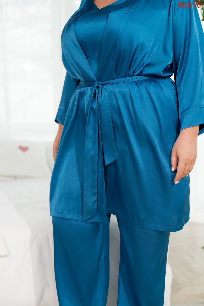 Костюм-трійка з шовку Армані – елегантність, легкість та ідеальний комфорт. Халат на запах без застібок, що красиво драпірується і створює витончений силует. У комплекті пояс, який фіксується за допомогою двох шльовок з боків. Манжети на рукавах надають завершеного вигляду. Майка на тонких бретелях із регулюванням, що забезпечує ідеальну посадку. Дві діагональні виточки спереду підкреслюють лінії фігури, надаючи образу витонченості. Штани вільного крою із гумкою на талії забезпечують максимальний комфорт. Бічні кишені надають практичності. Шовк Армані - це преміальна тканина з м'якою текстурою, що струмує, яка дарує відчуття ніжності на шкірі. Вона невагома, приємна до тіла, добре пропускає повітря та має легкий шляхетний блиск. Цей костюм – ідеальний вибір для тих, хто цінує вишуканий стиль, затишок та розкішні матеріали.