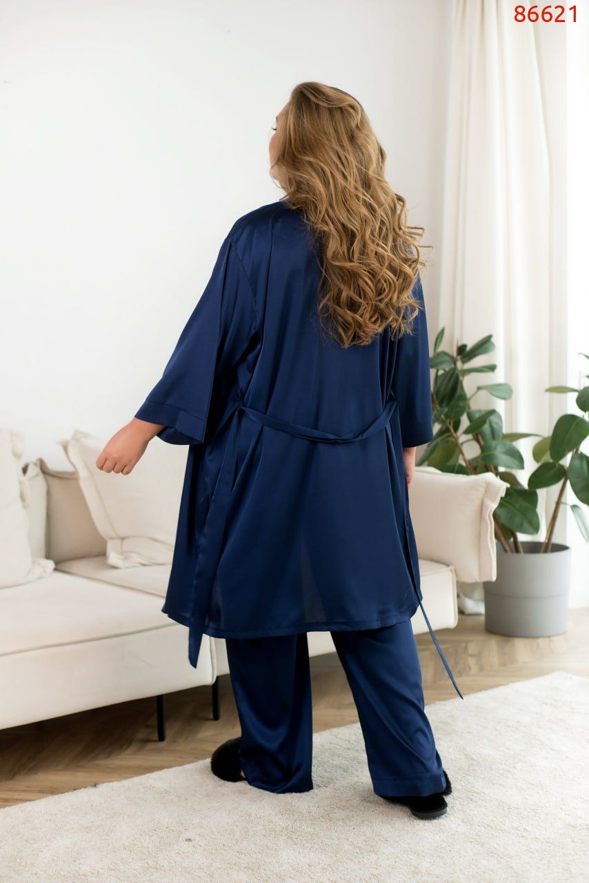 Костюм-трійка з шовку Армані – елегантність, легкість та ідеальний комфорт. Халат на запах без застібок, що красиво драпірується і створює витончений силует. У комплекті пояс, який фіксується за допомогою двох шльовок з боків. Манжети на рукавах надають завершеного вигляду. Майка на тонких бретелях із регулюванням, що забезпечує ідеальну посадку. Дві діагональні виточки спереду підкреслюють лінії фігури, надаючи образу витонченості. Штани вільного крою із гумкою на талії забезпечують максимальний комфорт. Бічні кишені надають практичності. Шовк Армані - це преміальна тканина з м'якою текстурою, що струмує, яка дарує відчуття ніжності на шкірі. Вона невагома, приємна до тіла, добре пропускає повітря та має легкий шляхетний блиск. Цей костюм – ідеальний вибір для тих, хто цінує вишуканий стиль, затишок та розкішні матеріали.
