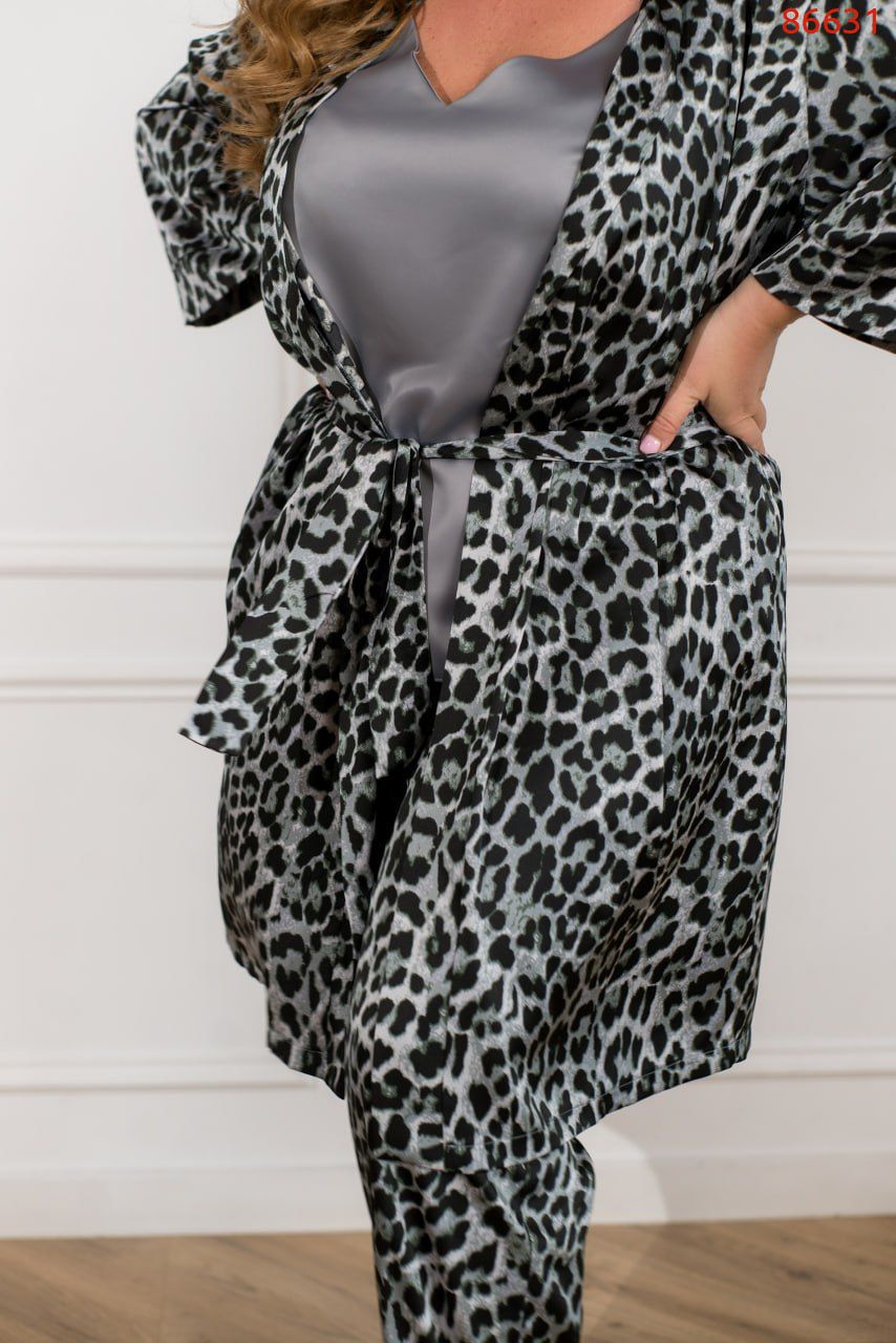 Костюм-трійка з шовку Армані – елегантність, легкість та ідеальний комфорт. Халат на запах без застібок, що красиво драпірується і створює витончений силует. У комплекті пояс, який фіксується за допомогою двох шльовок з боків. Манжети на рукавах надають завершеного вигляду. Майка на тонких бретелях із регулюванням, що забезпечує ідеальну посадку. Дві діагональні виточки спереду підкреслюють лінії фігури, надаючи образу витонченості. Штани вільного крою із гумкою на талії забезпечують максимальний комфорт. Бічні кишені надають практичності. Шовк Армані - це преміальна тканина з м'якою текстурою, що струмує, яка дарує відчуття ніжності на шкірі. Вона невагома, приємна до тіла, добре пропускає повітря та має легкий шляхетний блиск. Цей костюм – ідеальний вибір для тих, хто цінує вишуканий стиль, затишок та розкішні матеріали.