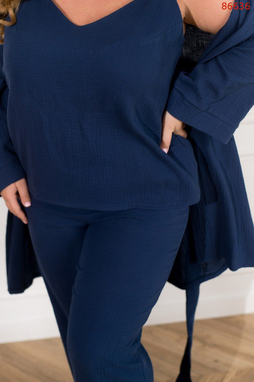 Костюм-трійка з мусліну – стильний та комфортний комплект для домашнього затишку та відпочинку. Халат на запах без застібок, що надає йому легкої невимушеності. У комплекті йде ремінь, який фіксується за допомогою двох шльовок з боків. Довгі рукави завершуються манжетами, що надають вишуканості. Майка на тонких бретелях з можливістю регулювання ідеально сідає по фігурі. Дві діагональні виточки спереду надають виробу елегантного вигляду. Штани з вільним кроєм дарують комфорт та свободу рухів. Завдяки гумці на талії вони чудово сідають, а бічні кишені надають практичності. Муслін - це натуральна, легка і дихаюча тканина, що приємно огортає тіло і створює максимальний комфорт у будь-яку пору року. Цей костюм ідеально поєднує витонченість, зручність та ніжність, даючи відчуття легкості щодня.
