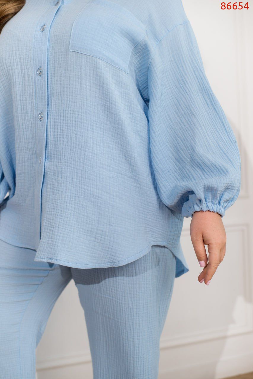 Домашній костюм із мусліну – ідеальне поєднання ніжності, свободи та елегантності. Сорочка – легка та повітряна, з коміром-стійкою та акуратною нагрудною кишенею. Вона має подовжену спинку та коротший перед, що додає силуету елегантності та легкості. Довгі вільні рукави на гумці забезпечують затишок і комфорт. Штани – комфортні та стильні, з вільним кроєм, гумкою на талії та зручними бічними кишенями. Муслін – це натуральна, м’яка тканина, що дозволяє шкірі дихати, даруючи комфорт у будь-яку пору року. Цей костюм – ідеальний варіант для тих, хто цінує легкість, свободу рухів і природну елегантність.
