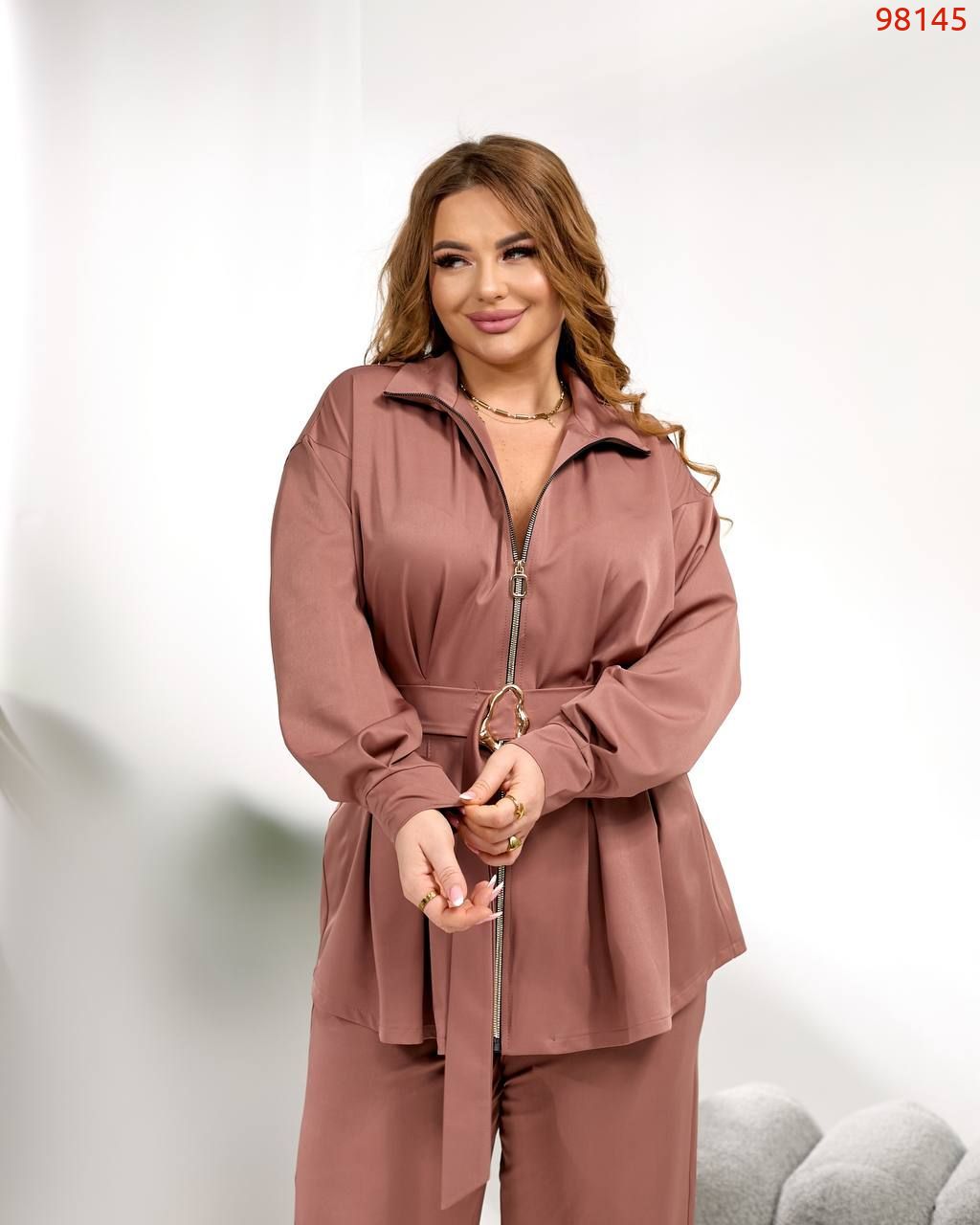 Жіночий костюм, що складається з блузи на блискавці та широких штанів.