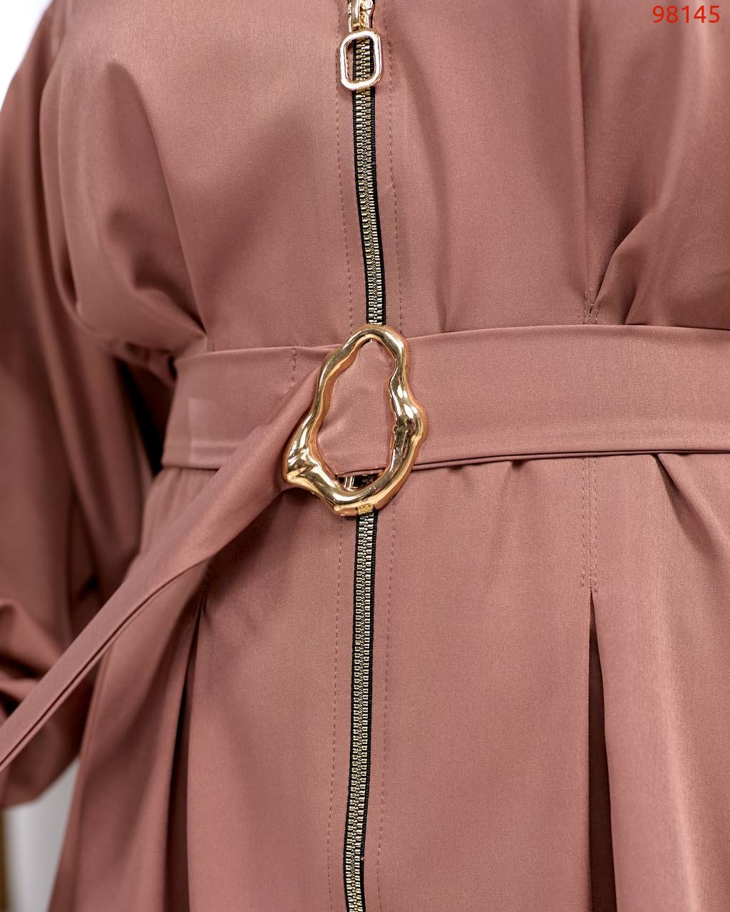 Комір: стійка (можливість носіння у відкритому та закритому вигляді).Пояс: знімний, із декоративною золотистою пряжкою, регулює посадку по талії і змінює настрій образу.