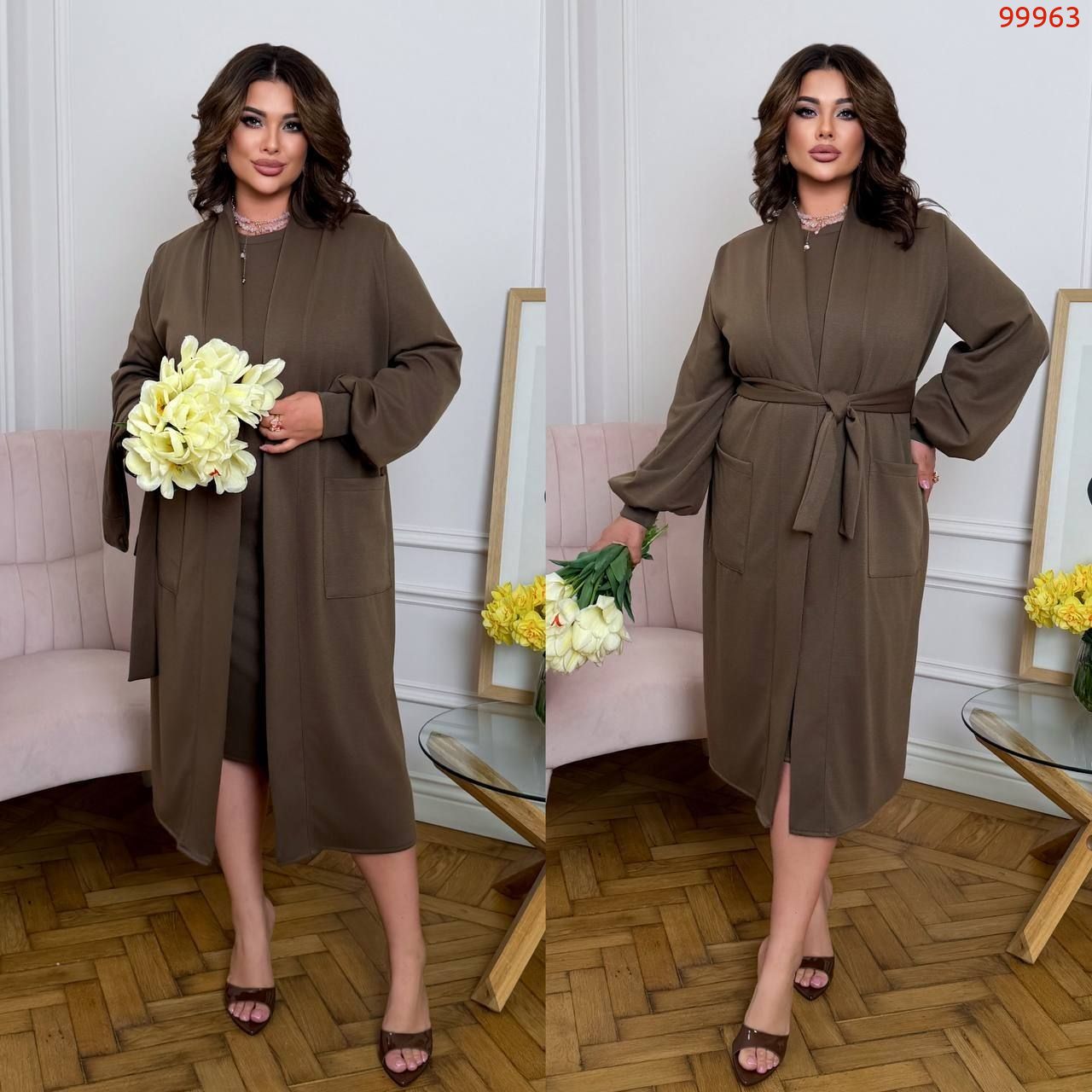 Кардиган на запах з поясом , бічні кишені , рукав широкий на манжеті . Сукня приталеного покрою , рукав короткий .