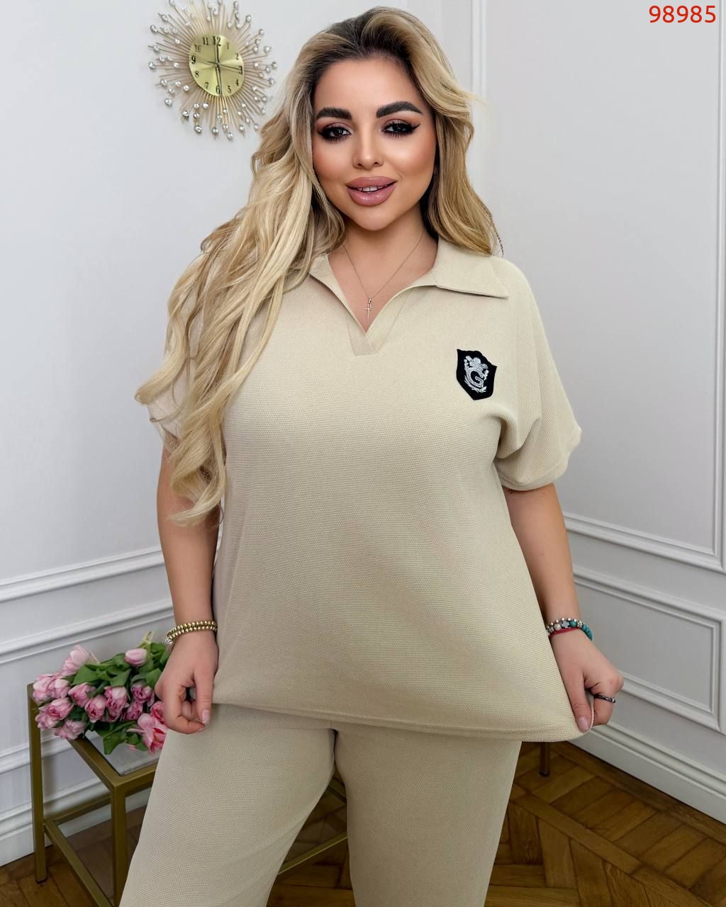 Тканина: трикотаж еластан: футболка поло у стилі оверсайз з Акс + штани з високою посадкою на еластичній гумці, з кишенями в бічних швах, низ штанів на гумці