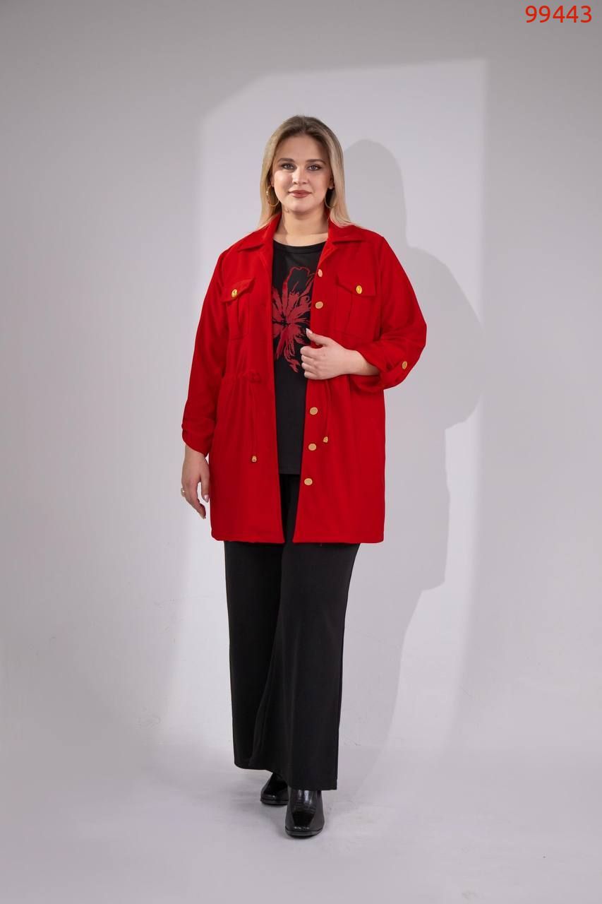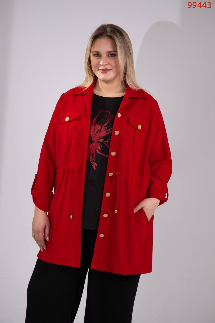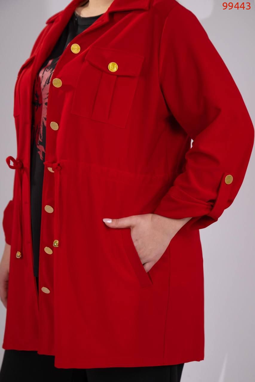 Костюм -трійка : подовжена кофта на ґудзиках , на грудях робочі кишені з ґудзиком , з боків кишені, довгий рукав на патіку ( можна регулювати довжину ), талія фіксується куліскою ( можна регулювати обʼєм ) . Штани на резинці , з боків кишені , по низу збоку розрізи . Футболка з якісним накатом ( не полиняє , не потріскає) , рукав до ліктя.