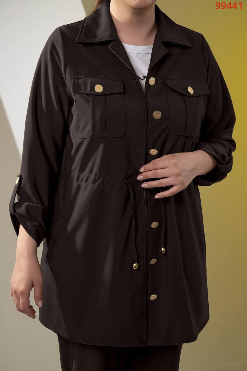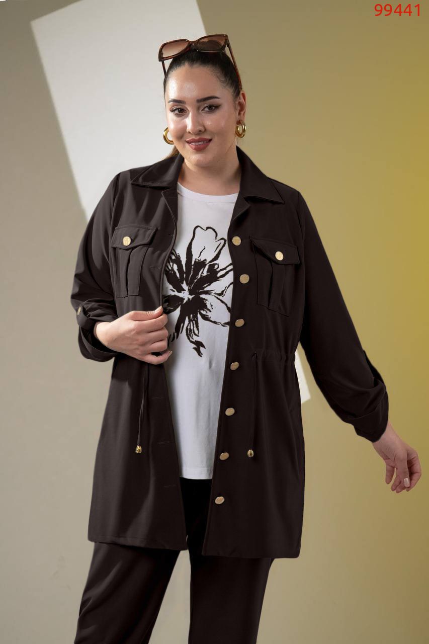 Костюм -трійка : подовжена кофта на ґудзиках , на грудях робочі кишені з ґудзиком , з боків кишені, довгий рукав на патіку ( можна регулювати довжину ), талія фіксується куліскою ( можна регулювати обʼєм ) . Штани на резинці , з боків кишені , по низу збоку розрізи . Футболка з якісним накатом ( не полиняє , не потріскає) , рукав до ліктя.