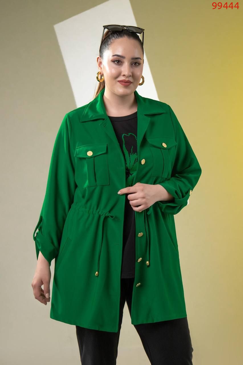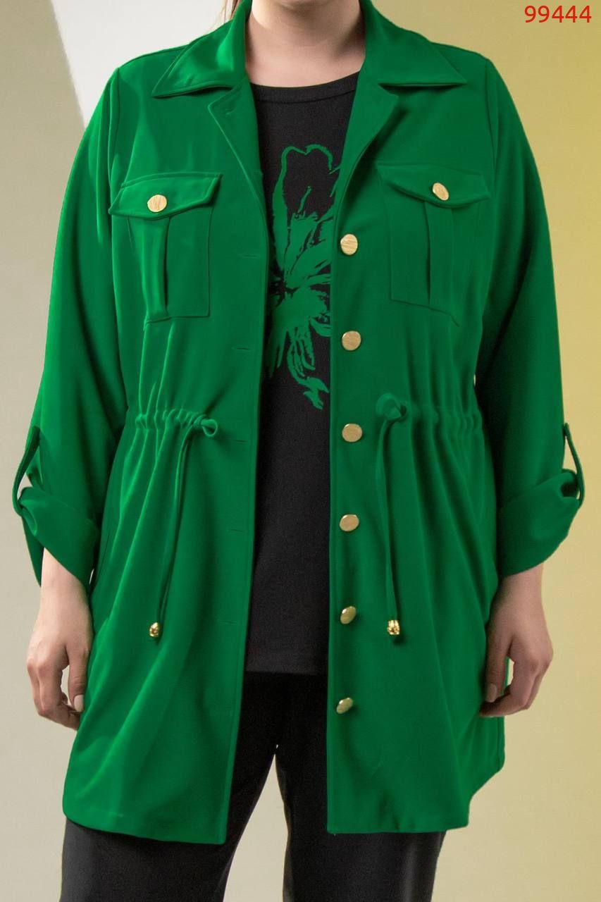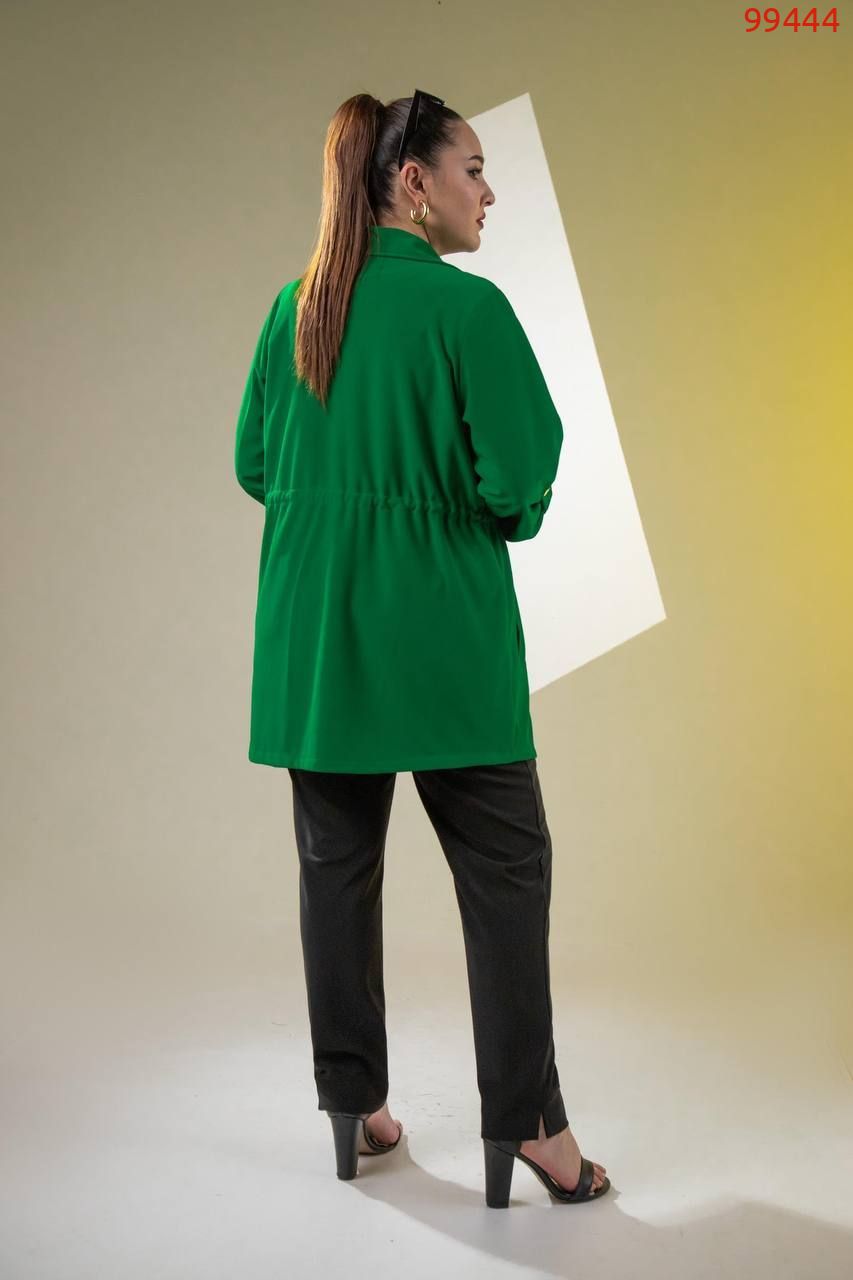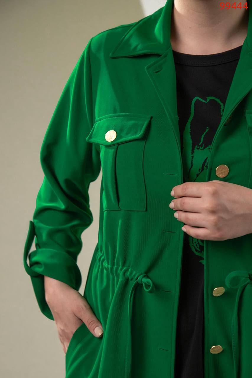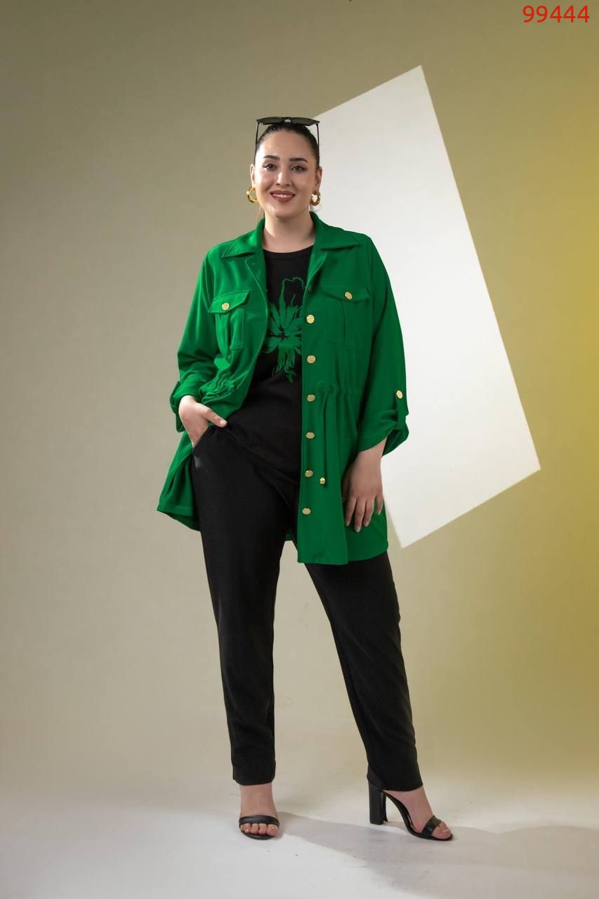 Костюм -трійка : подовжена кофта на ґудзиках , на грудях робочі кишені з ґудзиком , з боків кишені, довгий рукав на патіку ( можна регулювати довжину ), талія фіксується куліскою ( можна регулювати обʼєм ) . Штани на резинці , з боків кишені , по низу збоку розрізи . Футболка з якісним накатом ( не полиняє , не потріскає) , рукав до ліктя.