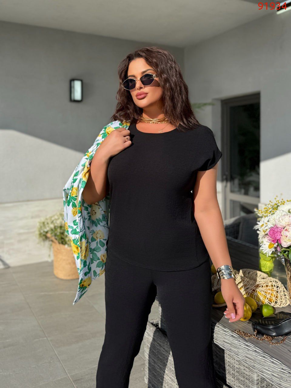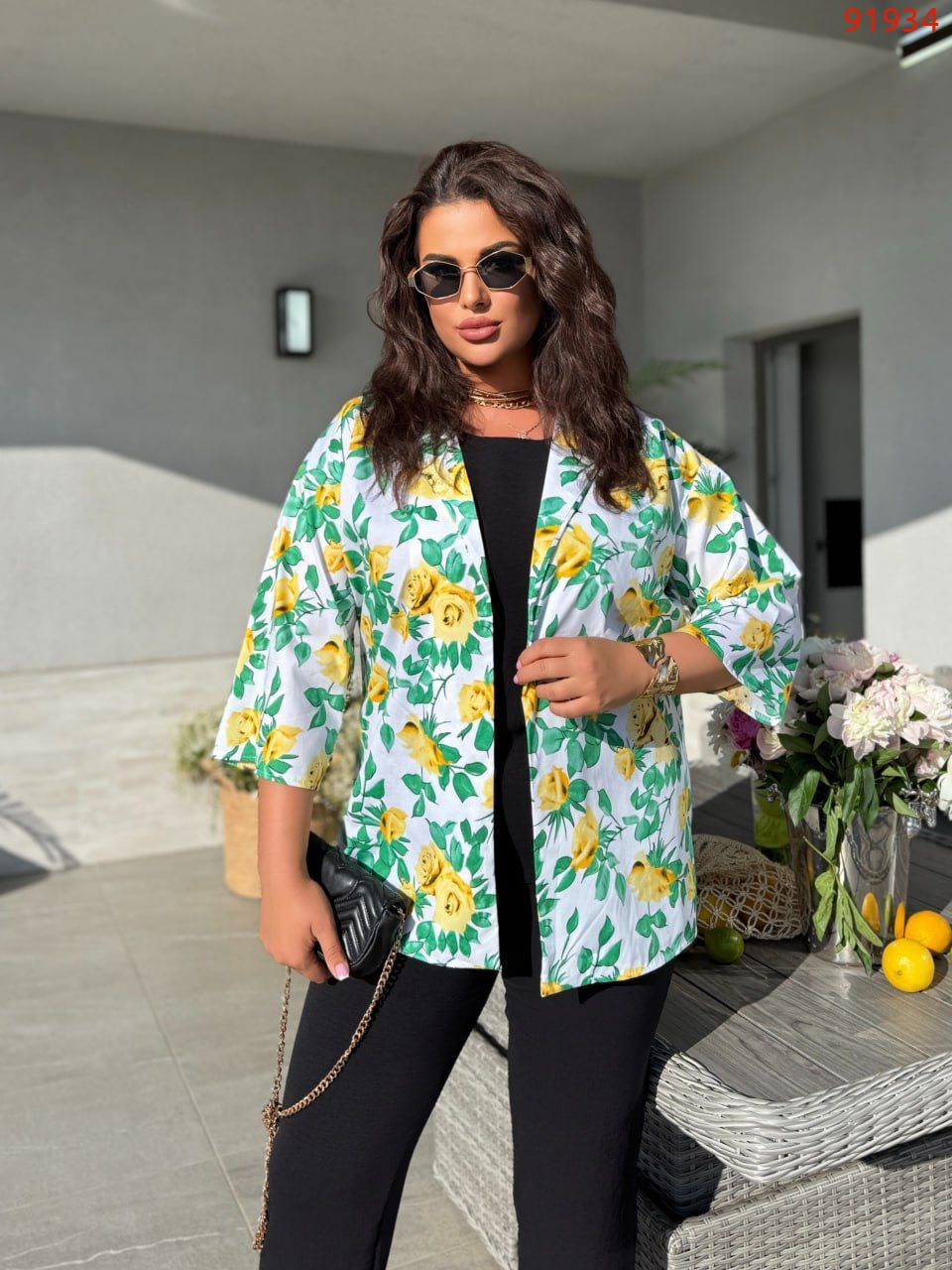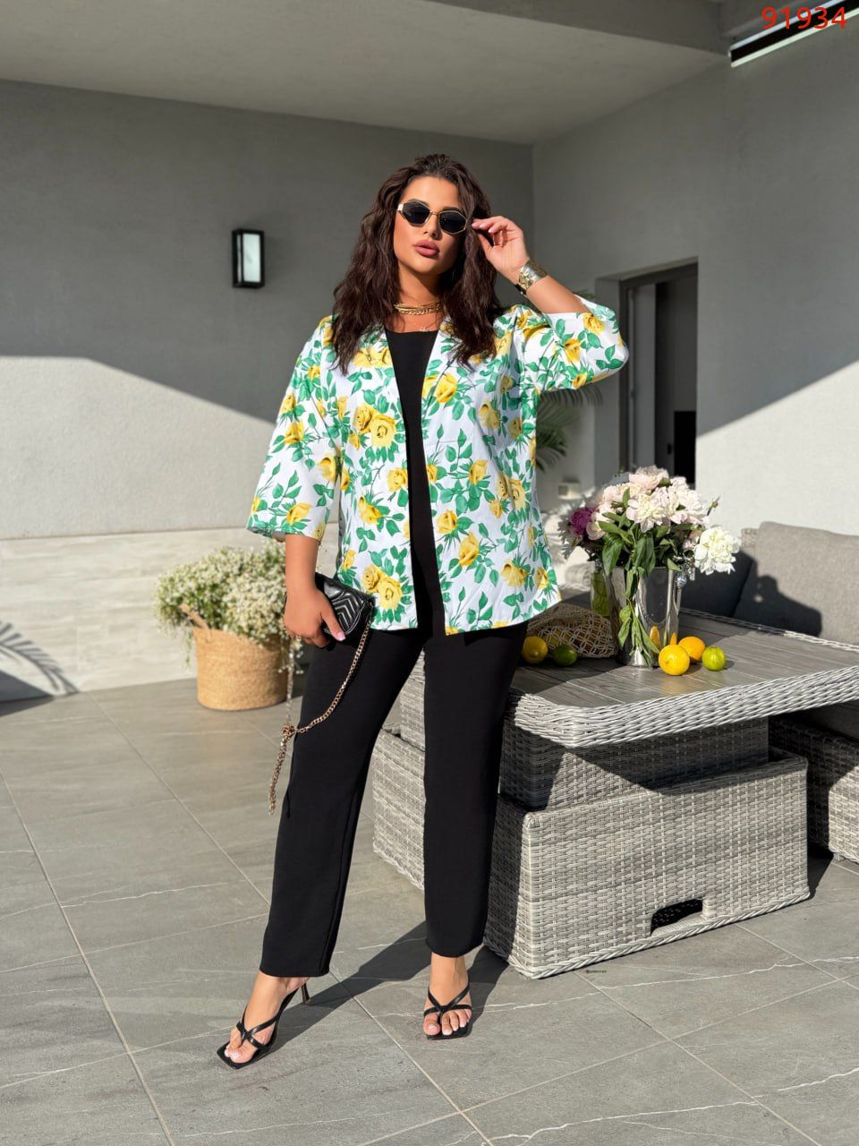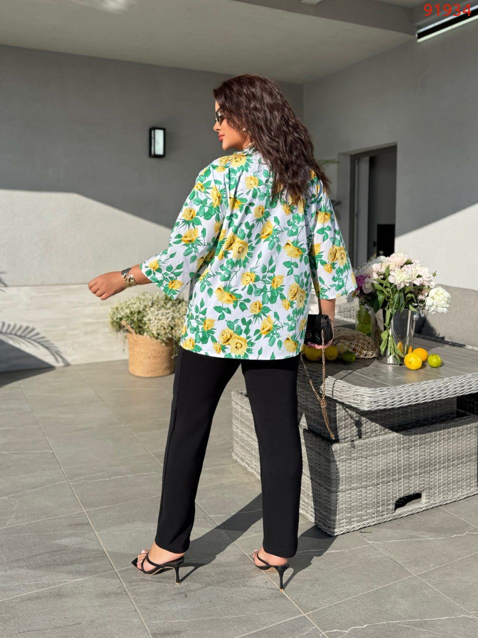 Костюм із легкої тканини зачаровує ніжним квітковим принтом. Його прямий силует дарує свободу рухів, а трохи прозора структура додає загадковості та романтичності. Комплект- це ідеальний вибір для тих, хто цінує стиль, комфорт та бездоганний зовнішній вигляд у будь-якій ситуації!