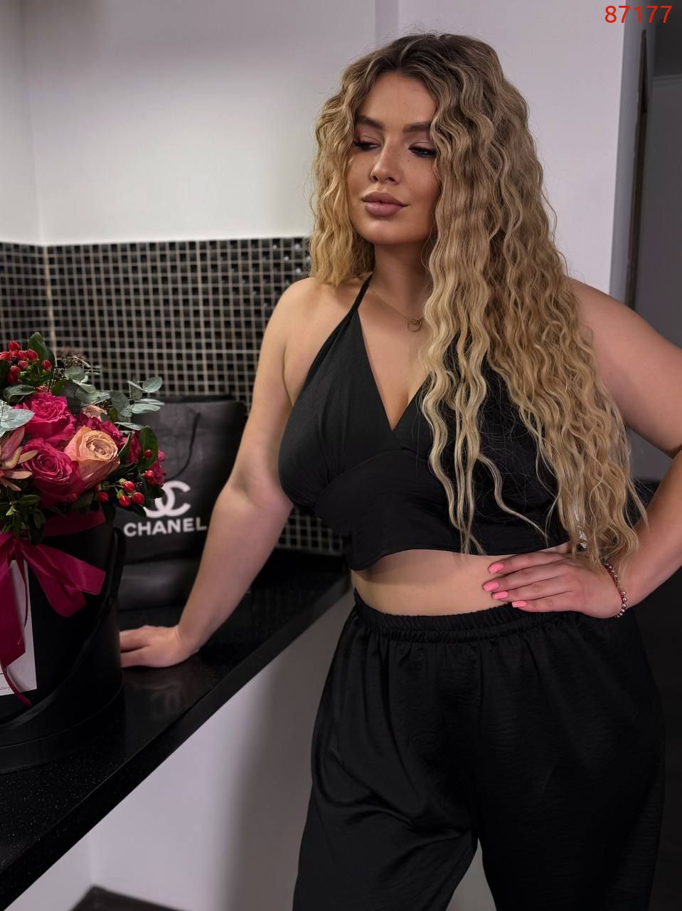 Довжина брюк 77/110. Пояс на гумці, висока посадка. Довжина блузи по переду -78 см. Застібки - ґудзики По бокам розрізи. Можно носити в оверсайзному стилі або зав’язати попереду. Топ з відкритою спиною , завʼязується позаду на любий розмір.
