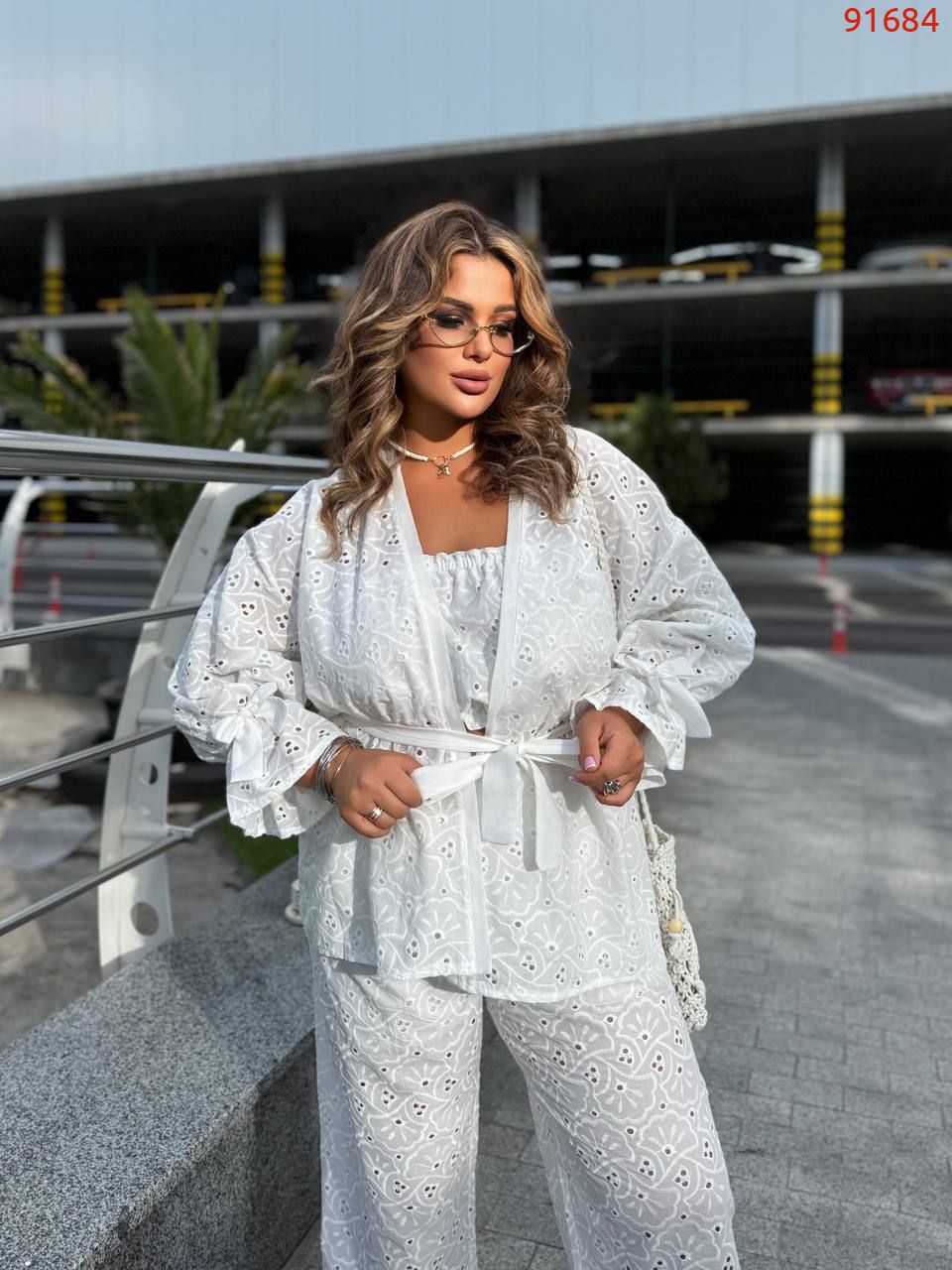 Довжина брюк 77/110. Пояс на гумці, висока посадка. Кардиган одягається на запах, підвʼязується поясом . Рукава внизу широкі, є знімни завʼязки, якими можна зробити іншу форму рукава завʼязав їх. Топ - на гумці вгорі і внизу.