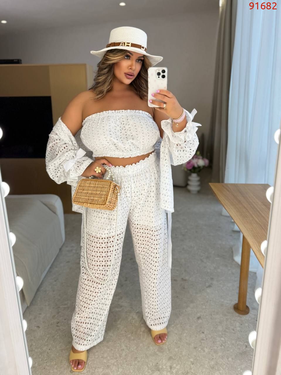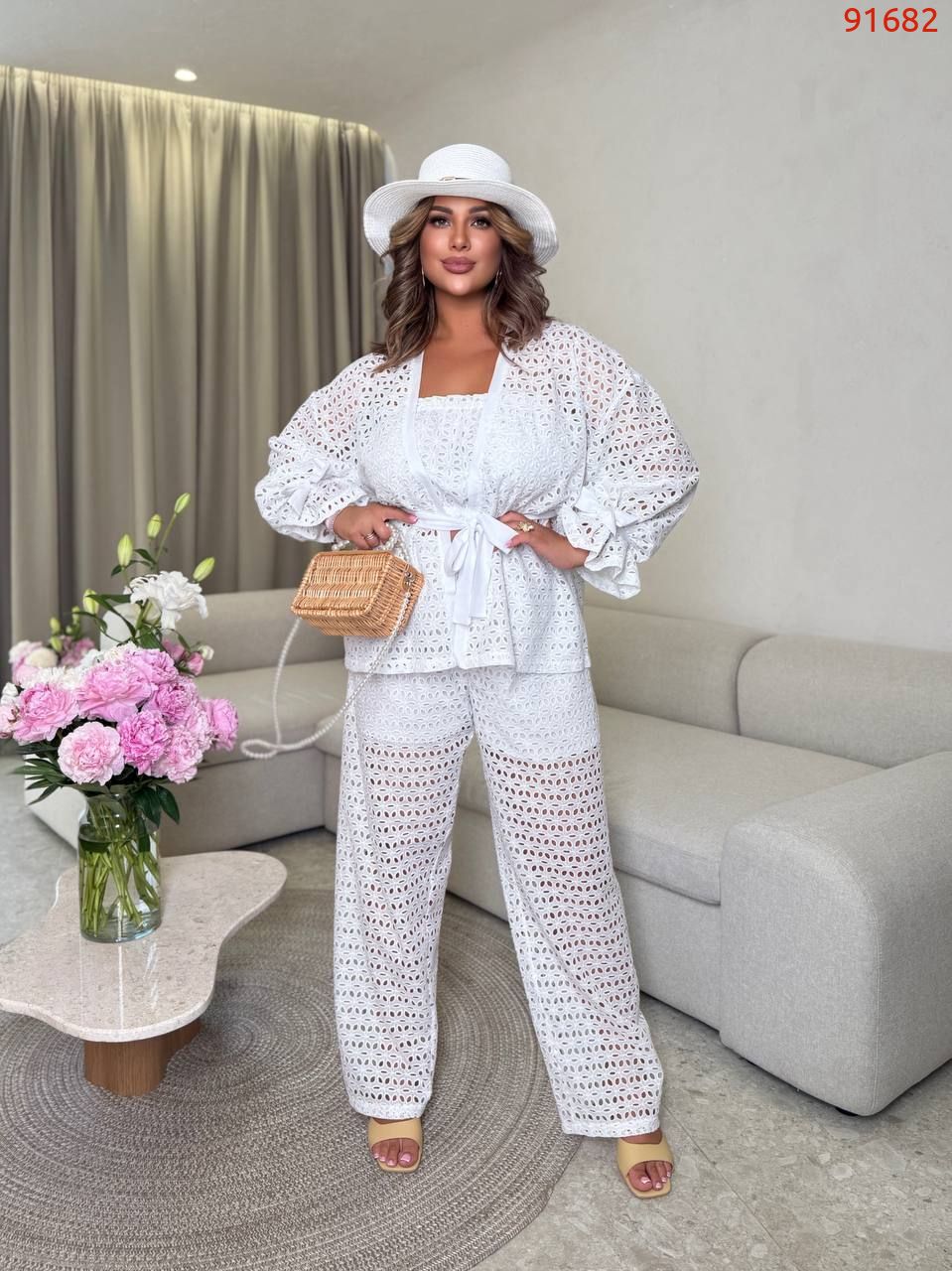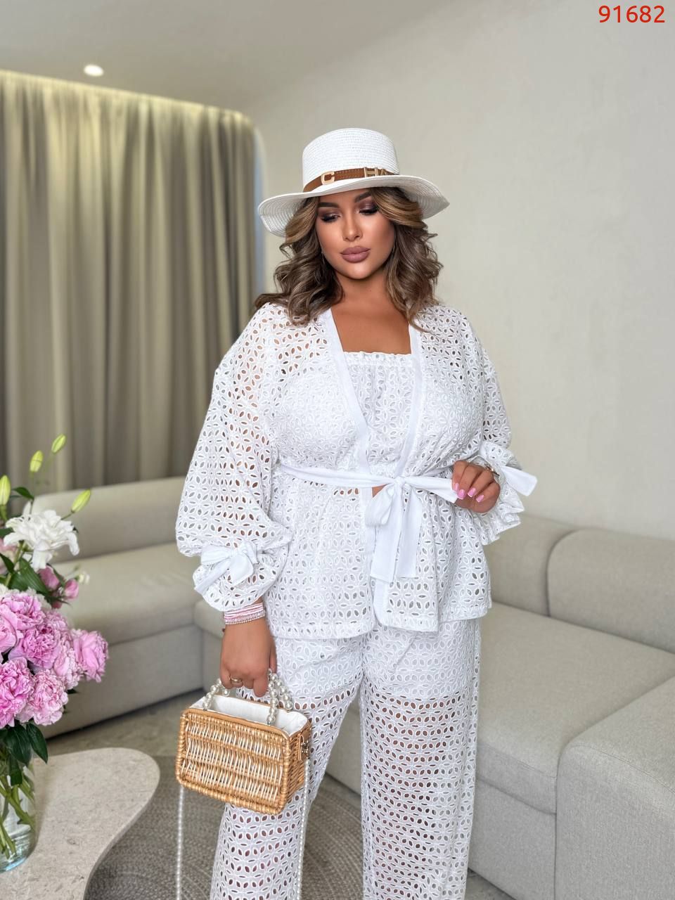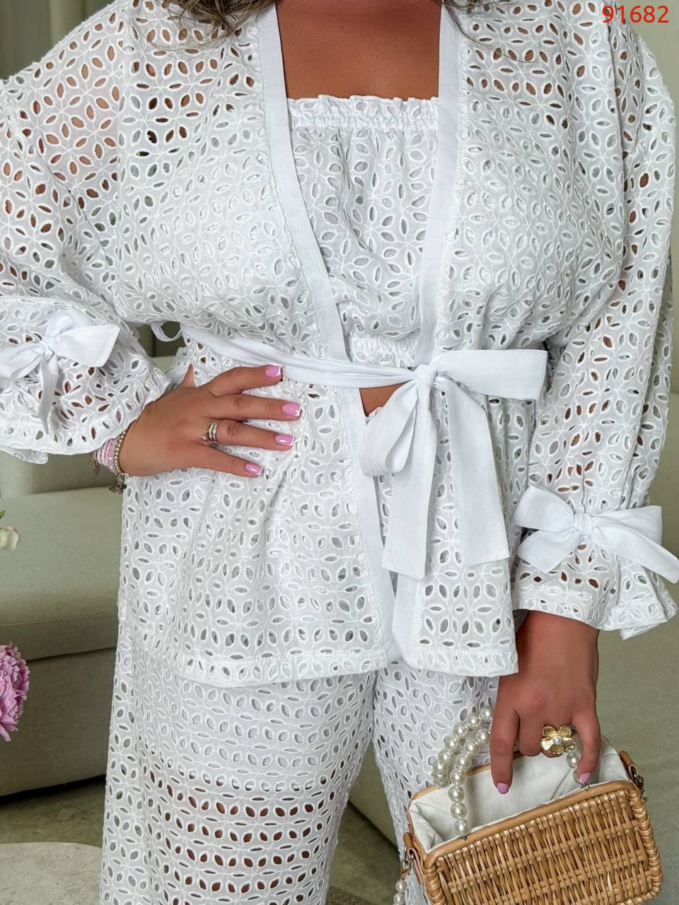 Довжина брюк 77/110. Пояс на гумці, висока посадка. Кардиган одягається на запах, підвʼязується поясом . Рукава внизу широкі, є знімни завʼязки, якими можна зробити іншу форму рукава завʼязав їх. Топ - на гумці вгорі і внизу.