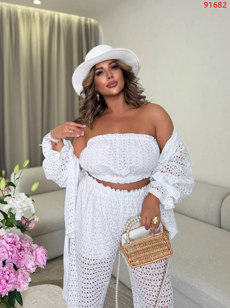 Тканина:100% бавовняна прошва (вишивка з перфорацією). Підкладка брюк - батист (тонка бавовна тканина)