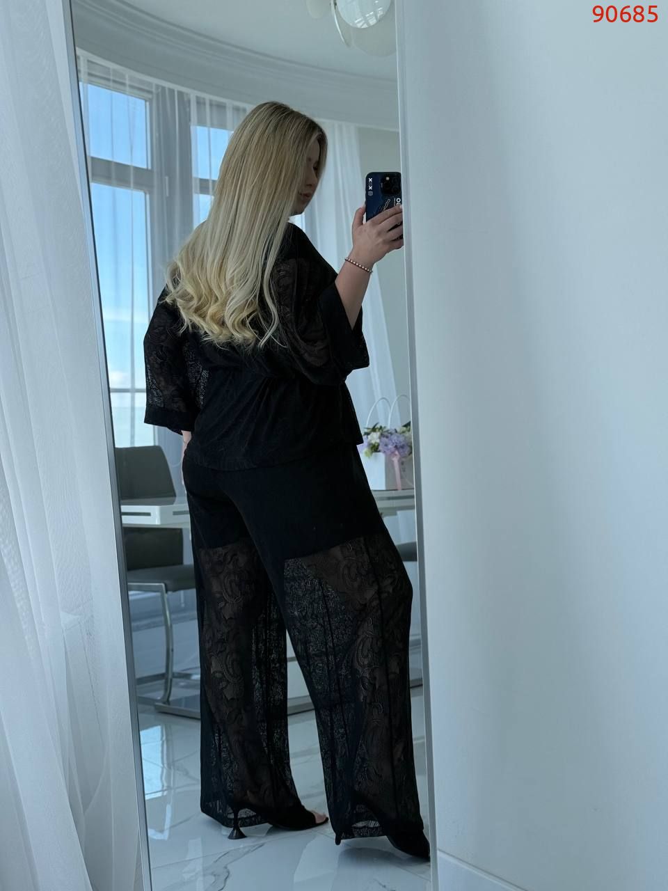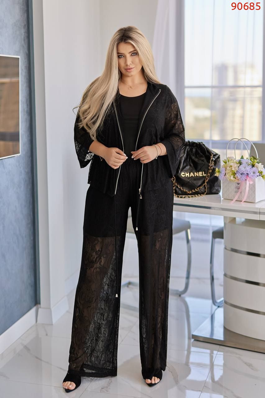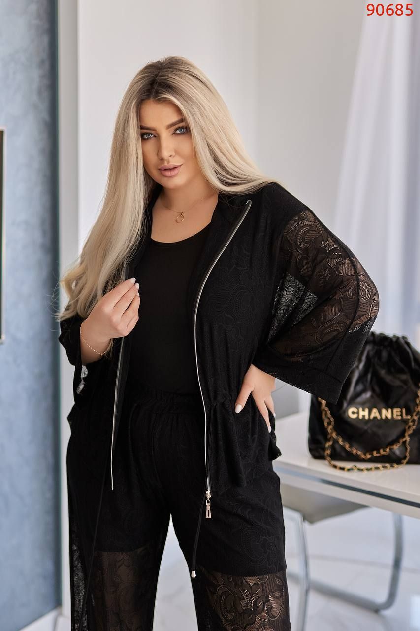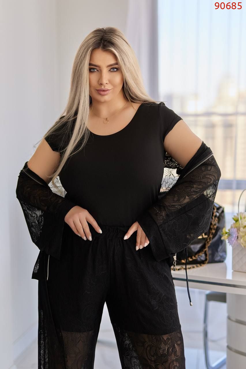 Кімоно гюпюр + футболка з мікро дайвінгу + брюки гіпюр і пришиті знизу шорти з мікро дайвінгу.