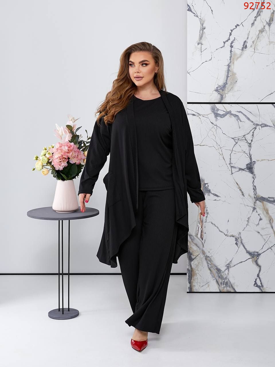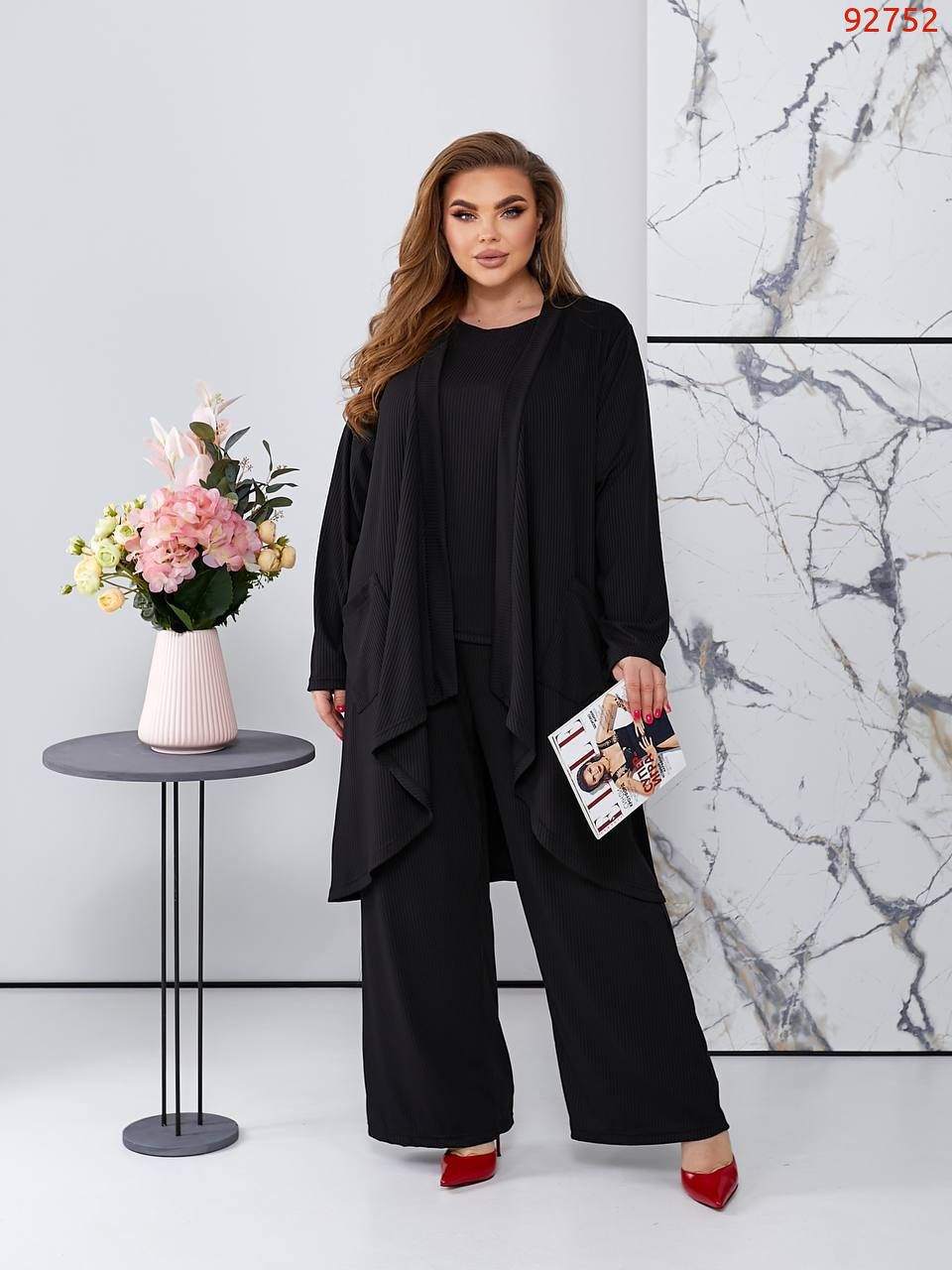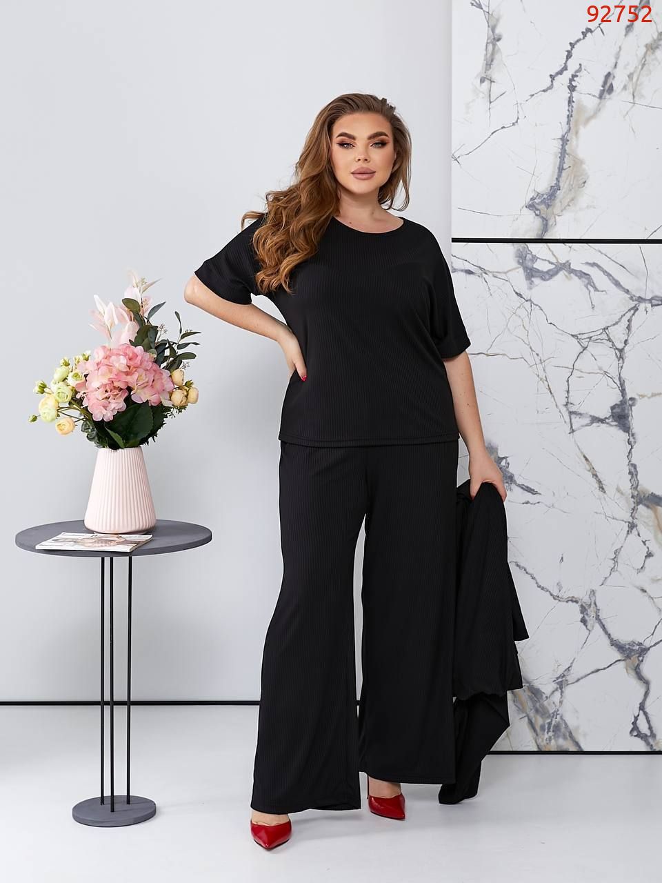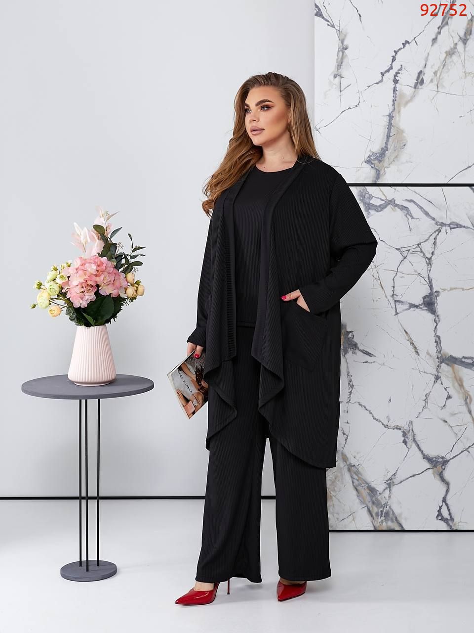Стильний костюм підійде як на вихід, так і на кожен день. У костюм входить: футболка, штани та кардиган. Штани вільного крою з високою посадкою, кардиган не застібається.