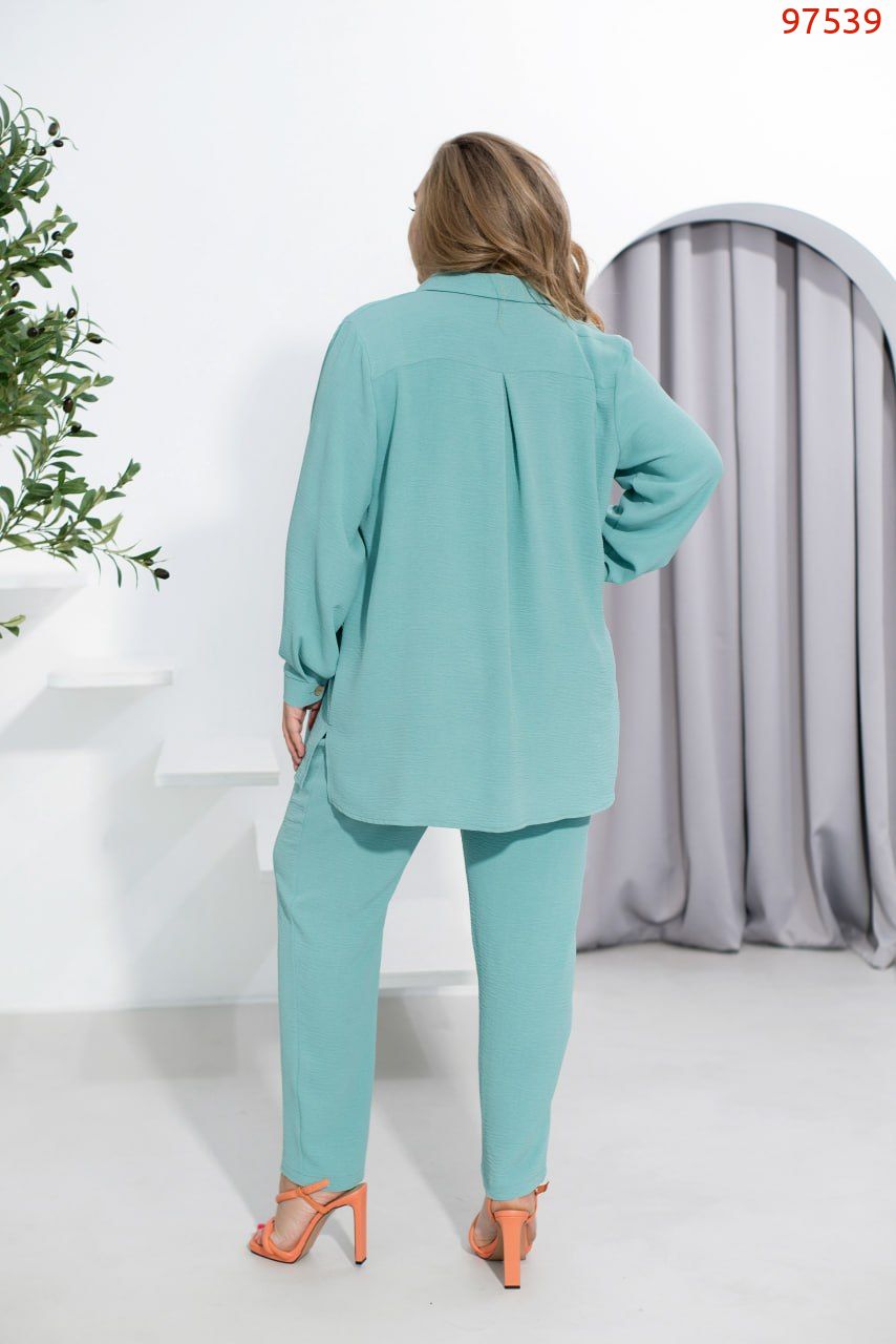 Елегантний та стильний костюм трійка великого розміру. Верхня сорочка подовжена, з відкладним комірцем, на грудях накладна кишеня, з боків - довгі розрізи. На рукавах манжети, на манжетах по одному гудзику. Брюки з високою талією, з боків - кишені в шві, до поясу вшито резинку. Майка з півкруглим вирізом горловини, на грудях виточки, з боків подолу - розрізи. Без кишень і застібок.