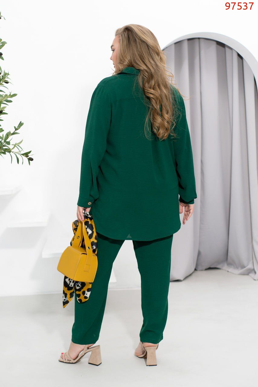 Елегантний та стильний костюм трійка великого розміру. Верхня сорочка подовжена, з відкладним комірцем, на грудях накладна кишеня, з боків - довгі розрізи. На рукавах манжети, на манжетах по одному гудзику. Брюки з високою талією, з боків - кишені в шві, до поясу вшито резинку. Майка з півкруглим вирізом горловини, на грудях виточки, з боків подолу - розрізи. Без кишень і застібок.
